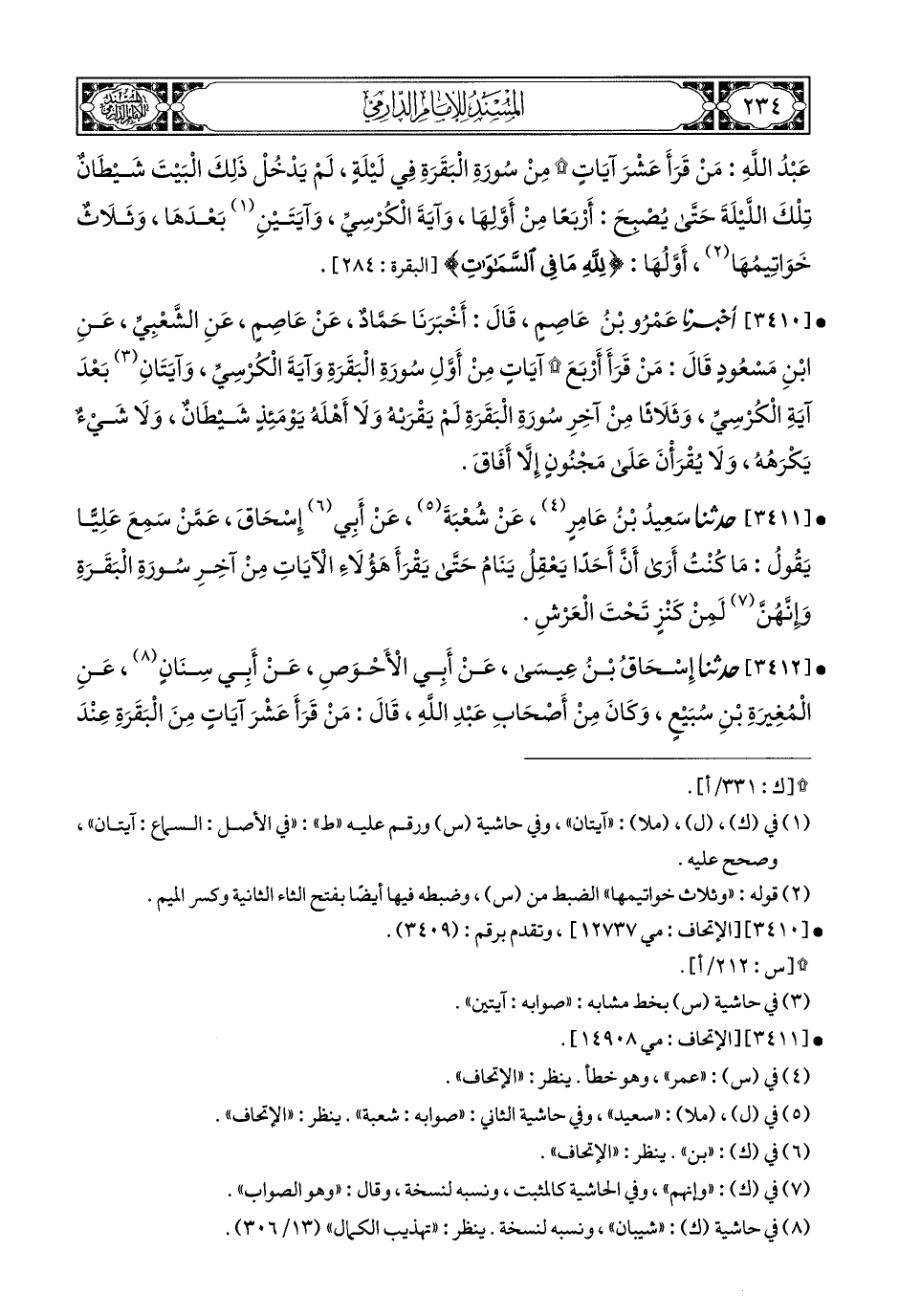 3412- حَدَّثَنَا إِسْحَاقُ بْنُ عِيسَى, عَنْ أَبِي الأَحْوَصِ, عَنْ أَبِي سِنَانٍ, عَنِ الْمُغِيرَةِ بْنِ سُبَيْعٍ, وَكَانَ مِنْ أَصْحَابِ عَبْدِ اللهِ, قَالَ: مَنْ قَرَأَ عَشْرَ آيَاتٍ مِنَ الْبَقَرَةِ عِنْدَ مَنَامِهِ لَمْ يَنْسَ الْقُرْآنَ أَرْبَعُ آيَاتٍ مِنْ أَوَّلِهَا, وَآيَةُ الْكُرْسِيِّ, وَآيَتَانِ بَعْدَهَا, وَثَلاَثٌ مِنْ آخِرِهَا (1).
