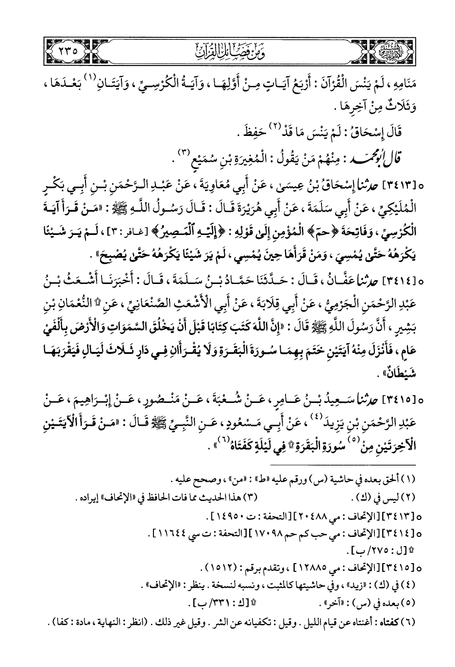 3413- حَدَّثَنَا إِسْحَاقُ بْنُ عِيسَى, عَنْ أَبِي مُعَاوِيَةَ (1), عَنْ عَبْدِ الرَّحْمَنِ بْنِ أَبِي بَكْرٍ الْمُلَيْكِيِّ, عَنْ أَبِي سَلَمَةَ, عَنْ أَبِي هُرَيْرَةَ, قَالَ: قَالَ رَسُولُ الله صَلى الله عليه وسلم: مَنْ قَرَأَ آيَةَ الْكُرْسِيِّ وَفَاتِحَةَ {حم} الْمُؤْمِنِ, إِلَى قَوْلِهِ: {إِلَيْهِ الْمَصِيرُ} لَمْ يَرَ شَيْئًا يَكْرَهُهُ حَتَّى يُمْسِيَ, وَمَنْ قَرَأَهَا حِينَ يُمْسِي لَمْ يَرَ شَيْئًا يَكْرَهُهُ حَتَّى يُصْبِحَ.