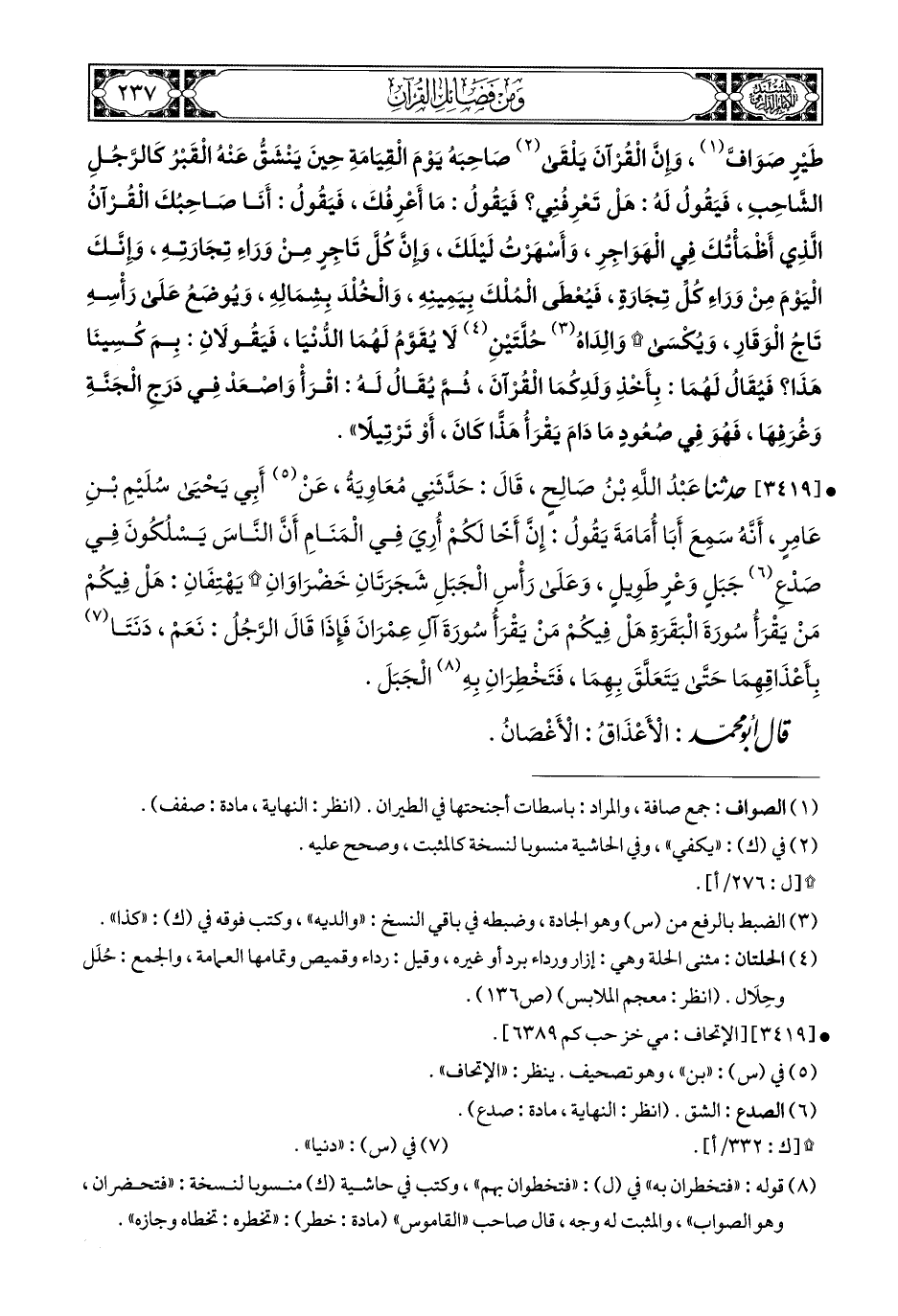 3419- حَدَّثَنَا عَبْدُ اللهِ بْنُ صَالِحٍ, قَالَ: حَدَّثَنِي مُعَاوِيَةُ, عَنْ أَبِي يَحْيَى: سُلَيْمُ بْنُ عَامِرٍ, أَنَّهُ سَمِعَ أَبَا أُمَامَةَ يَقُولُ: إِنَّ أَخًا لَكُمْ أُرِيَ فِي الْمُنَامِ أَنَّ النَّاسَ يَسْلُكُونَ فِي صَدْعِ جَبَلٍ وَعْرٍ طَوِيلٍ, وَعَلَى رَأْسِ الْجَبَلِ شَجَرَتَانِ خَضْرَاوَانِ يَهْتِفَانِ: هَلْ فِيكُمْ مَنْ يَقْرَأُ سُورَةَ الْبَقَرَةِ؟ هَلْ فِيكُمْ مَنْ يَقْرَأُ سُورَةَ آلِ عِمْرَانَ؟ فَإِذَا قَالَ الرَّجُلُ: نَعَمْ, دَنَتَا بِأَعْذَاقِهِمَا, حَتَّى يَتَعَلَّقَ بِهِمَا, فَتَخْطِرَانِ (1) بِهِ الْجَبَلَ.