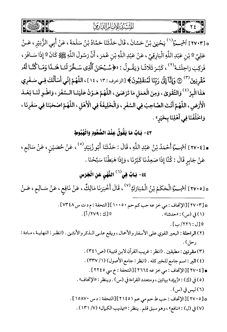 2703- أَخبَرَنا يَحْيَى بْنُ حَسَّانَ, قَالَ: حَدَّثَنَا حَمَّادُ بْنُ سَلَمَةَ, عَنْ أَبِي الزُّبَيْرِ, عَنْ عَلِيِّ بْنِ عَبْدِ اللهِ الْبَارِقِيِّ, عَنْ عَبْدِ اللهِ بْنِ عُمَرَ؛ أَنَّ رَسُولَ اللهِ صَلى الله عَليهِ وسَلم كَانَ إِذَا سَافَرَ, فَرَكِبَ رَاحِلَتَهُ, كَبَّرَ ثَلاَثًا, وَيَقُولُ: {سُبْحَانَ الَّذِي سَخَّرَ لَنَا هَذَا وَمَا كُنَّا لَهُ مُقْرِنِينَ وَإِنَّا إِلَى رَبِّنَا لَمُنْقَلِبُونَ} اللهُمَّ إِنِّي أَسْأَلُكَ فِي سَفَرِي هَذَا الْبِرَّ وَالتَّقْوَى, وَمِنَ الْعَمَلِ مَا تَرْضَى, اللهُمَّ هَوِّنْ عَلَيْنَا السَّفَرَ, وَاطْوِ لَنَا بُعْدَ الأَرْضِ, اللهُمَّ أَنْتَ الصَّاحِبُ فِي السَّفَرِ, وَالْخَلِيفَةُ فِي الأَهْلِ, اللهُمَّ اصْحَبْنَا فِي سَفَرِنَا, وَاخْلُفْنَا فِي أَهْلِنَا بِخَيْرٍ.