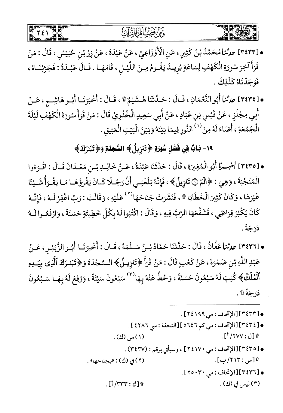 3436- حَدَّثَنَا عَفَّانُ, قَالَ: حَدَّثَنَا حَمَّادُ بْنُ سَلَمَةَ, قَالَ: أَخبَرَنا أَبُو الزُّبَيْرِ, عَنْ عَبْدِ اللهِ بْنِ ضَمْرَةَ, عَنْ كَعْبٍ, قَالَ: مَنْ قَرَأَ: {تَنْزِيلُ} (1) السَّجْدَةَ, وَ{تَبَارَكَ الَّذِي بِيَدِهِ الْمُلْكُ} (2), كُتِبَ لَهُ سَبْعُونَ حَسَنَةً, وَحُطَّ عَنْهُ بِهَا سَبْعُونَ سَيِّئَةً, وَرُفِعَ لَهُ بِهَا سَبْعُونَ دَرَجَةً.