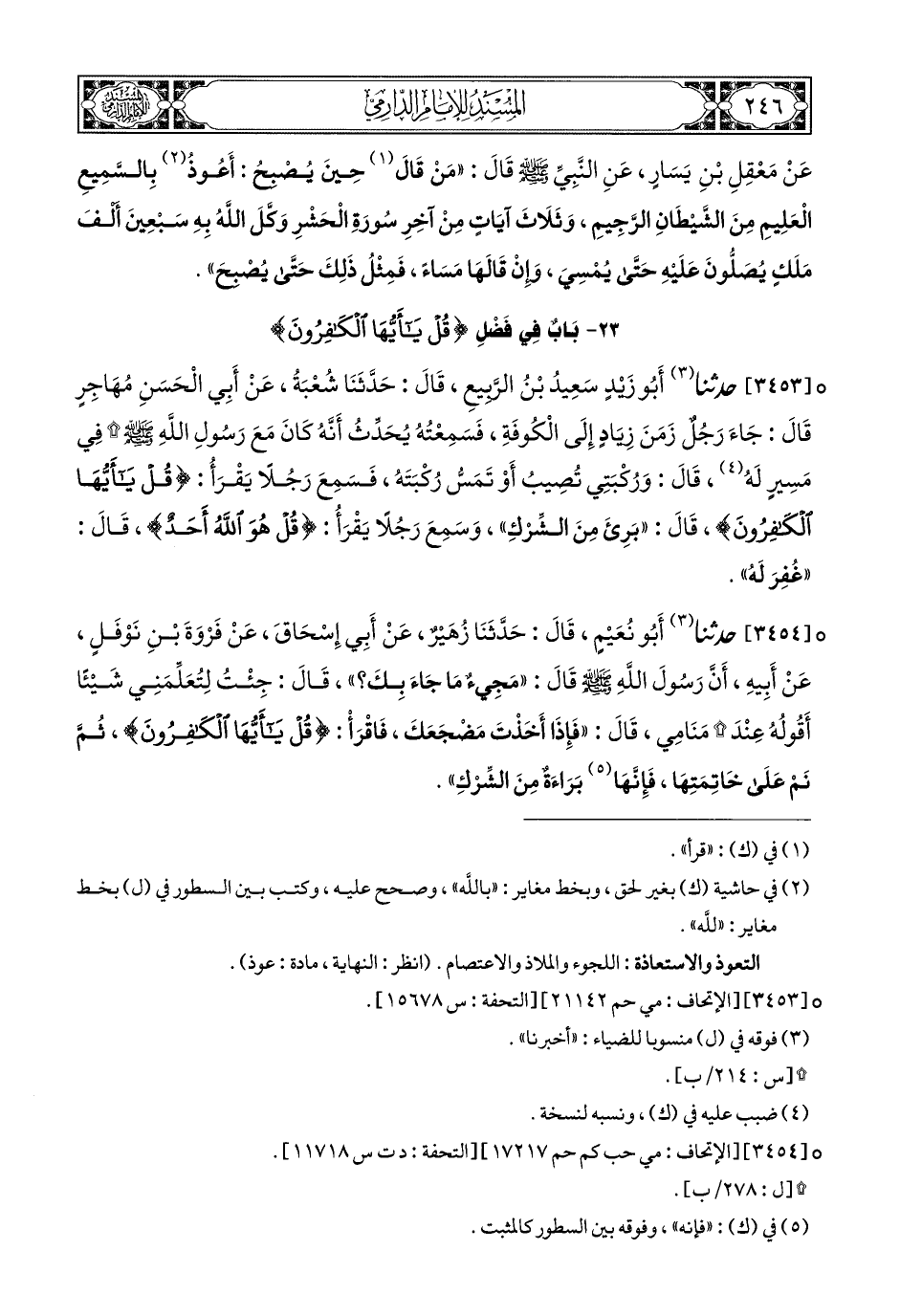 3453- حَدَّثَنَا أَبُو زَيْدٍ سَعِيدُ بْنُ الرَّبِيعِ, قَالَ: حَدَّثَنَا شُعْبَةُ, عَنْ أَبِي الْحَسَنِ: مُهَاجِرٍ, قَالَ: جَاءَ رَجُلٌ زَمَنَ زِيَادٍ إِلَى الْكُوفَةِ, فَسَمِعْتُهُ يُحَدِّثُ, أَنَّهُ كَانَ مَعَ رَسُولِ الله صَلى الله عليه وسلم فِي مَسِيرٍ لَهُ, قَالَ: وَرُكْبَتِي تُصِيبُ, أَوْ تَمَسُّ رُكْبَتَهُ, فَسَمِعَ رَجُلًا يَقْرَأُ: {قُلْ يَا أَيُّهَا الْكَافِرُونَ} قَالَ: بَرِئَ مِنَ الشِّرْكِ, وَسَمِعَ رَجُلًا يَقْرَأُ: {قُلْ هُوَ اللهُ أَحَدٌ}, قَالَ: غُفِرَ لَهُ.