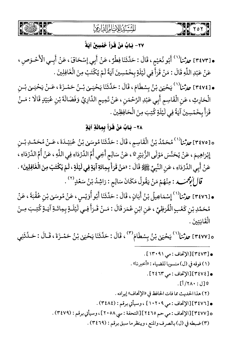 3477- حَدَّثَنَا يَحْيَى بْنُ بِسْطَامَ, قَالَ: حَدَّثَنَا يَحْيَى بْنُ حَمْزَةَ, قَالَ: حَدَّثَنِي زَيْدُ بْنُ وَاقِدٍ, عَنْ سُلَيْمَانَ بْنِ مُوسَى, عَنْ كَثِيرِ بْنِ مُرَّةَ, عَنْ تَمِيمٍ الدَّارِيِّ, أَنَّ رَسُولَ الله صَلى الله عليه وسلم قَالَ: مَنْ قَرَأَ بِمِئَةِ آيَةٍ فِي لَيْلَةٍ كُتِبَ لَهُ قُنُوتُ لَيْلَةٍ.