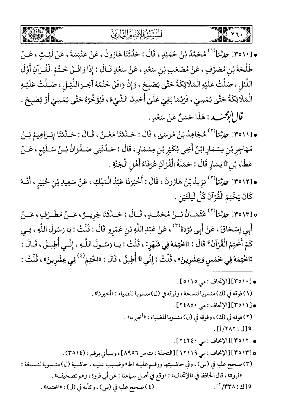 3513- حَدَّثَنَا عُثْمَانُ بْنُ مُحَمَّدٍ (1), قَالَ: حَدَّثَنَا جَرِيرٌ, عَنْ مُطَرِّفٍ, عَنْ أَبِي إِسْحَاقَ, عَنْ أَبِي بُرْدَةَ (2), عَنْ عَبْدِ الله بْنِ عَمْرٍو قَالَ: قُلْتُ: يَا رَسُولَ الله, فِي كَمْ أَخْتِمُ الْقُرْآنَ؟ قَالَ: اخْتِمْهُ فِي شَهْرٍ, قُلْتُ: يَا رَسُولَ الله, إِنِّي (3) أُطِيقُ, قَالَ: اخْتِمْهُ فِي خَمْسٍ وَعِشْرِينَ, قُلْتُ: إِنِّي أُطِيقُ, قَالَ: اخْتِمْ (4) فِي عِشْرِينَ, قُلْتُ: إِنِّي أُطِيقُ, قَالَ: اخْتِمْهُ فِي خَمْسَةَ عَشْرَ (5), قُلْتُ: إِنِّي أُطِيقُ (6), قَالَ: اخْتِمْهُ فِي خَمْسٍ, قُلْتُ: إِنِّي أُطِيقُ, قَالَ: لاَ.