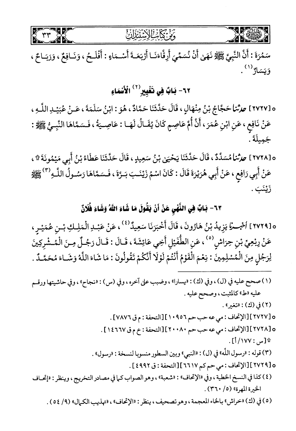 2729- أَخبَرَنا يَزِيدُ بْنُ هَارُونَ, قَالَ: أَخبَرَنا سَعِيدٌ (1), عَنْ عَبْدِ الْمَلِكِ بْنِ عُمَيْرٍ, عَنْ رِبْعِيِّ بْنِ حِرَاشٍ, عَنِ الطُّفَيْلِ, أَخِي عَائِشَةَ, قَالَ: قَالَ رَجُلٌ مِنَ الْمُشْرِكِينَ لِرَجُلٍ مِنَ الْمُسْلِمِينَ: نِعْمَ الْقَوْمُ أَنْتُمْ, لَوْلاَ أَنَّكُمْ تَقُولُونَ: مَا شَاءَ اللهُ وَشَاءَ مُحَمَّدٌ, فَسَمِعَ النَّبِيُّ صَلى الله عَليهِ وسَلم, فَقَالَ: لاَ تَقُولُوا: مَا شَاءَ اللهُ وَشَاءَ مُحَمَّدٌ, وَلَكِنْ قُولُوا: مَا شَاءَ اللهُ, ثُمَّ شَاءَ مُحَمَّدٌ.