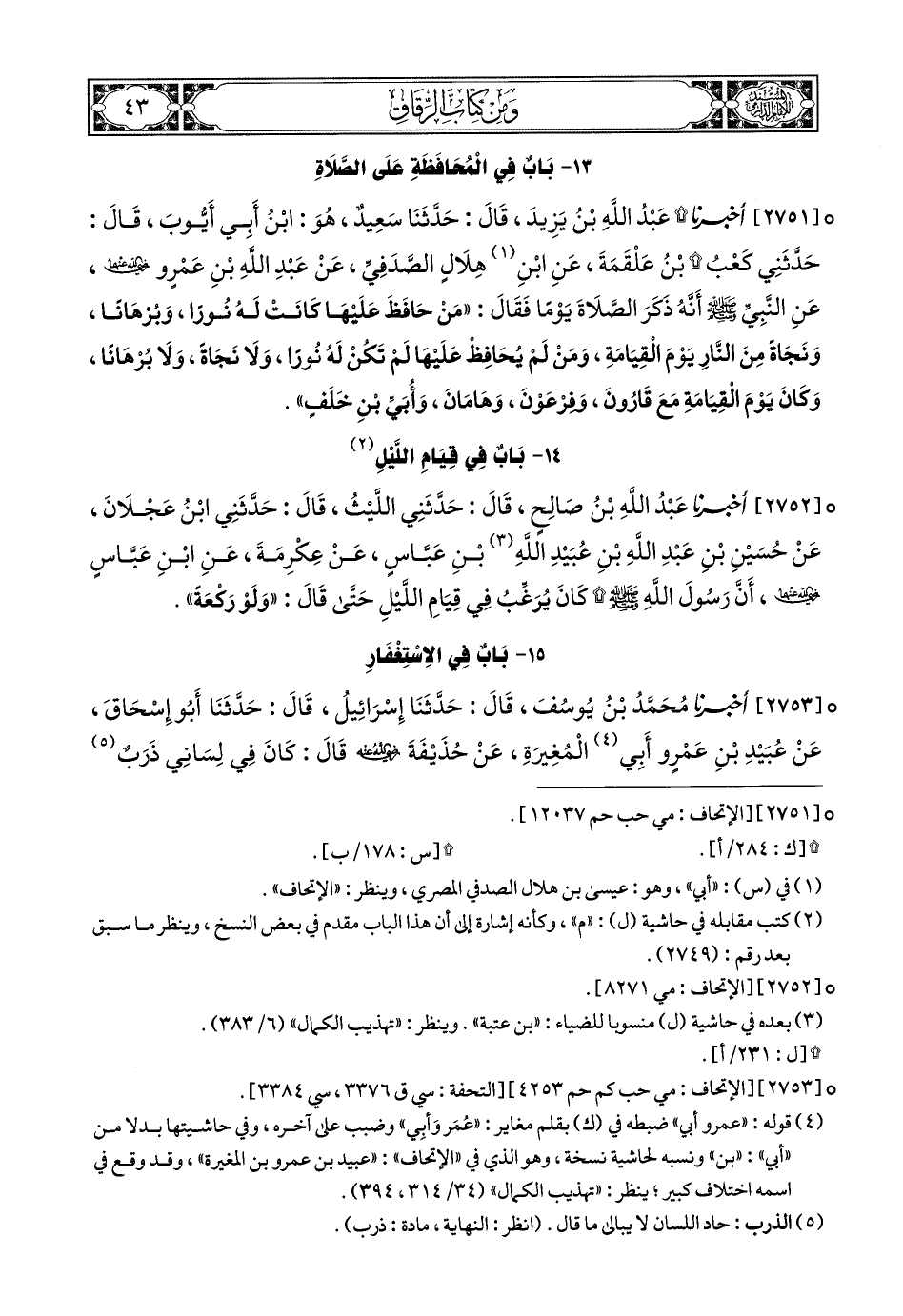 2751 - أَخبَرَنا عَبْدُ اللهِ بْنُ يَزِيدَ, قَالَ: حَدَّثَنَا سَعِيدٌ, هُوَ ابْنُ أَبِي أَيُّوبَ, قَالَ: حَدَّثَنِي كَعْبُ بْنُ عَلْقَمَةَ, عَنِ ابْنِ هِلاَلٍ (2) الصَّدَفِيِّ, عَنْ عَبْدِ اللهِ بْنِ عَمْرٍو رَضِيَ اللهُ عَنْهُمَا, عَنِ النَّبِيِّ صَلى الله عَليهِ وسَلم أَنَّهُ ذَكَرَ الصَّلاَةَ يَوْمًا, فَقَالَ: مَنْ حَافَظَ عَلَيْهَا كَانَتْ لَهُ نُورًا وَبُرْهَانًا وَنَجَاةً مِنَ النَّارِ يَوْمَ الْقِيَامَةِ, وَمَنْ لَمْ يُحَافِظْ عَلَيْهَا لَمْ تَكُنْ لَهُ نُورًا, وَلاَ نَجَاةً, وَلاَ بُرْهَانًا, وَكَانَ يَوْمَ الْقِيَامَةِ مَعَ قَارُونَ وَفِرْعَوْنَ وَهَامَانَ وَأُبَيِّ بْنِ خَلَفٍ.