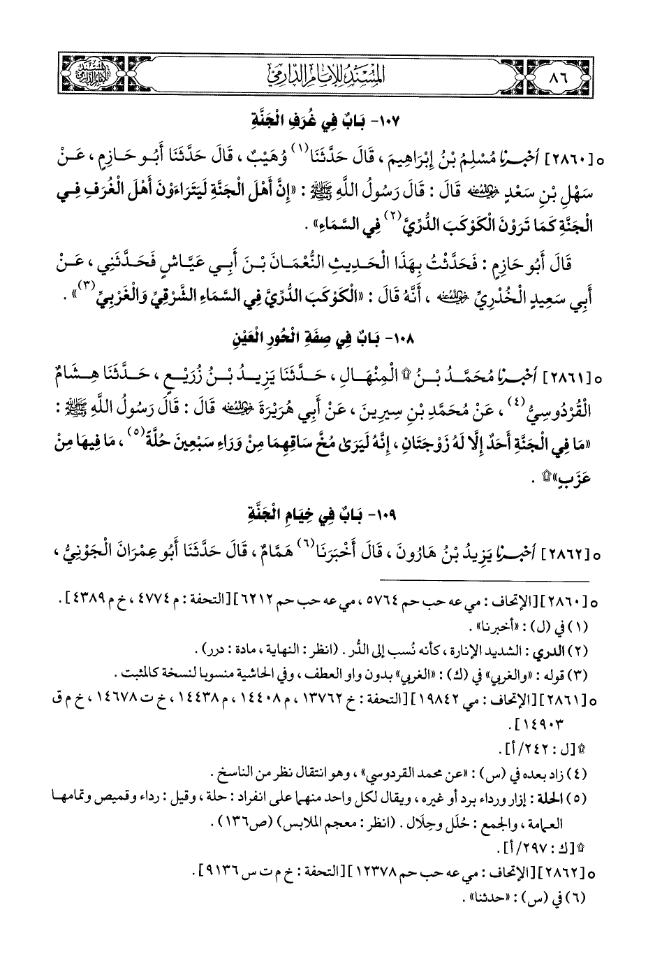 2860- أَخبَرَنا مُسْلِمُ بْنُ إِبْرَاهِيمَ, قَالَ: حَدَّثَنَا وُهَيْبٌ, قَالَ: حَدَّثَنَا أَبُو حَازِمٍ, عَنْ سَهْلِ بْنِ سَعْدٍ رَضِيَ اللهُ عَنْهُ, قَالَ: قَالَ رَسُولُ اللهِ صَلى الله عَليهِ وسَلم: إِنَّ أَهْلَ الْجَنَّةِ لَيَتَرَاءَوْنَ أَهْلَ الْغُرَفِ فِي الْجَنَّةِ, كَمَا تَرَوْنَ (1) الْكَوْكَبَ الدُّرِّيَّ فِي السَّمَاءِ.