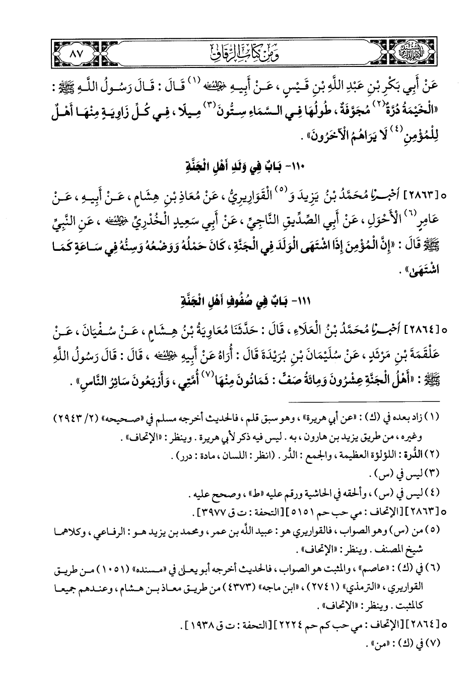 (1) قال محقق طبعة دار البشائر: وقع في الأصول الخطية والمطبوعة: محمد بن يزيد القواريري وهو تصحيف نبهت عليه قديمًا بتوفيق الله, وزدت واوًا قبل النسبة: القواريري؛ إذ لا يوجد في الرواة من اسمه: محمد بن يزيد القواريري, وبحمد الله ثبت صحة ما ذهبت إليه, إذ كذلك وقع في إتحاف المهرة ونسخة السليمانية, فله الحمد والمنّة.
