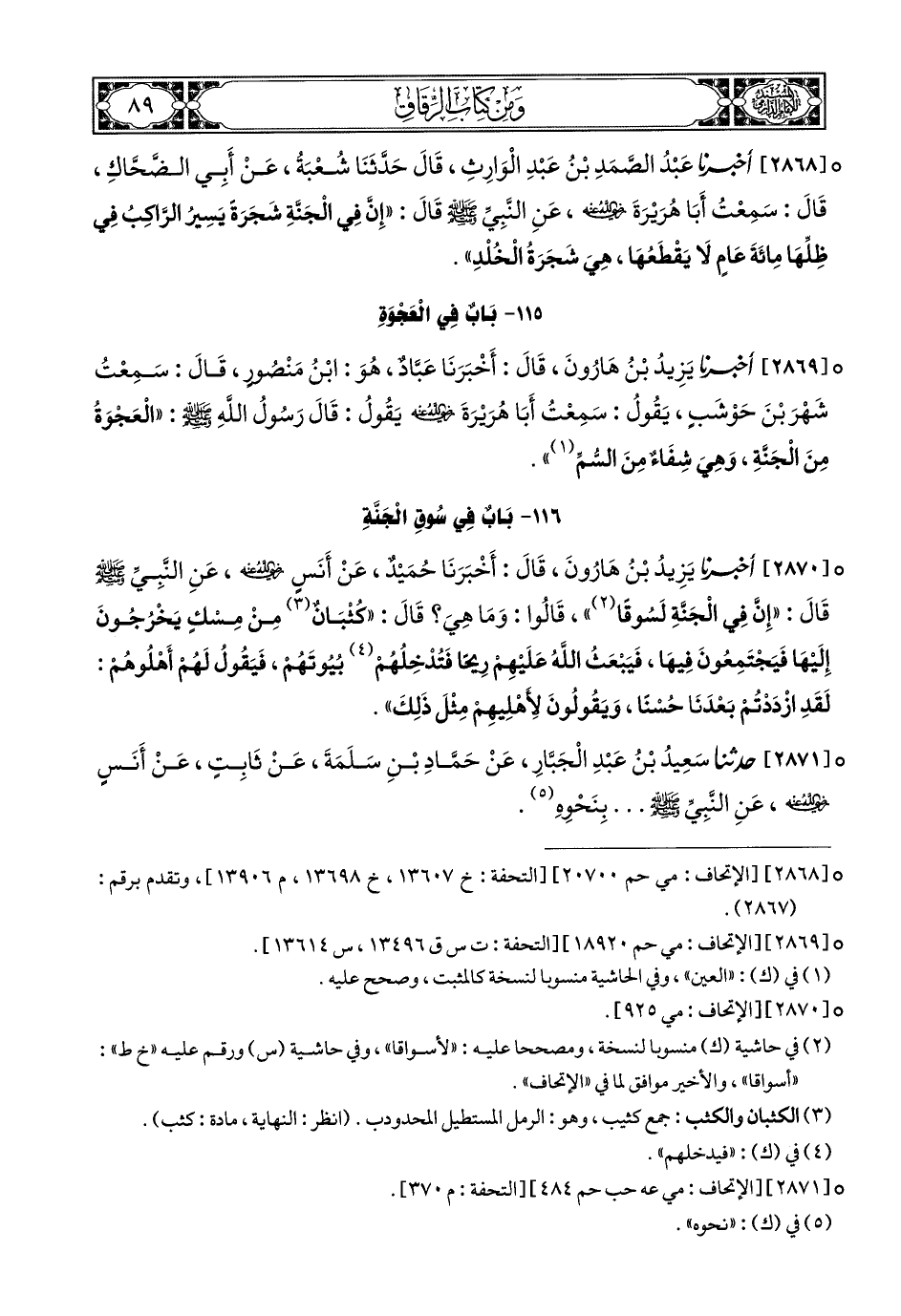 2870- أَخبَرَنا يَزِيدُ بْنُ هَارُونَ, قَالَ: أَخبَرَنا حُمَيْدٌ, عَنْ أَنَسٍ رَضِيَ اللهُ عَنْهُ, عَنِ النَّبِيِّ صَلى الله عَليهِ وسَلم, قَالَ: إِنَّ فِي الْجَنَّةِ لَسُوقًا (1), قَالُوا: وَمَا هِيَ؟ قَالَ: كُثْبَانٌ مِنْ مِسْكٍ, يَخْرُجُونَ إِلَيْهَا, فَيَجْتَمِعُونَ فِيهَا فَيَبْعَثُ اللهُ عَلَيْهِمْ رِيحًا فَتُدْخِلُهُمْ بُيُوتَهُمْ, فَيَقُولُ لَهُمْ أَهْلُوهُمْ: لَقَدِ ازْدَدْتُمْ بَعْدَنَا حُسْنًا, وَيَقُولُونَ لأَهْلِيهِمْ مِثْلَ ذَلِكَ.