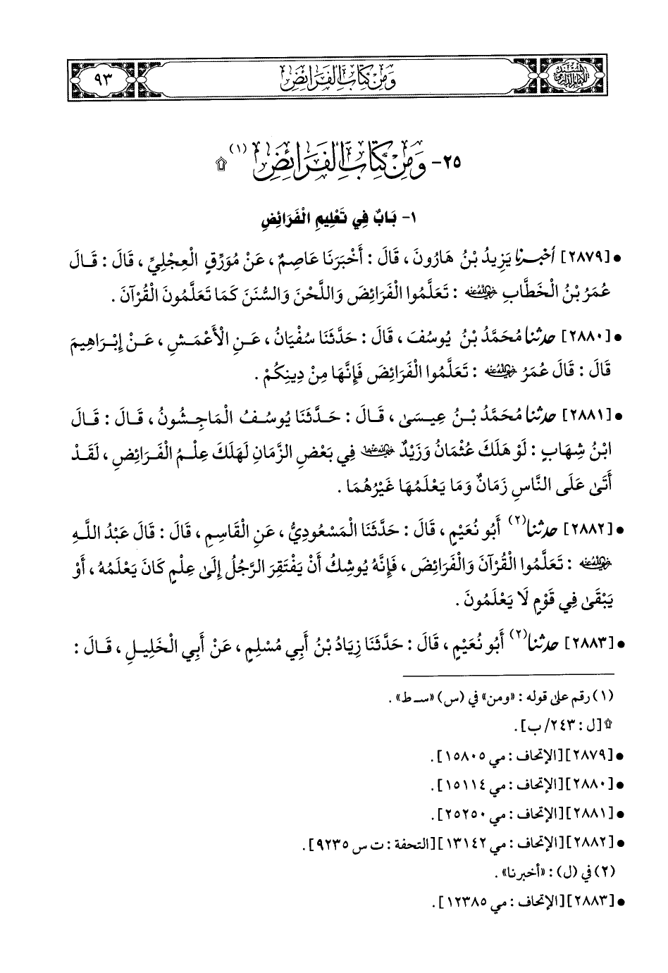 2879 - أَخبَرَنا يَزِيدُ بْنُ هَارُونَ, قَالَ: أَخبَرَنا عَاصِمٌ, عَنْ مُوَرِّقٍ الْعِجْلِيِّ, قَالَ: قَالَ عُمَرُ بْنُ الْخَطَّابِ رَضِيَ اللهُ عَنْهُ: تَعَلَّمُوا الْفَرَائِضَ وَاللَّحْنَ وَالسُّنَنَ, كَمَا تَعَلَّمُونَ الْقُرْآنَ.