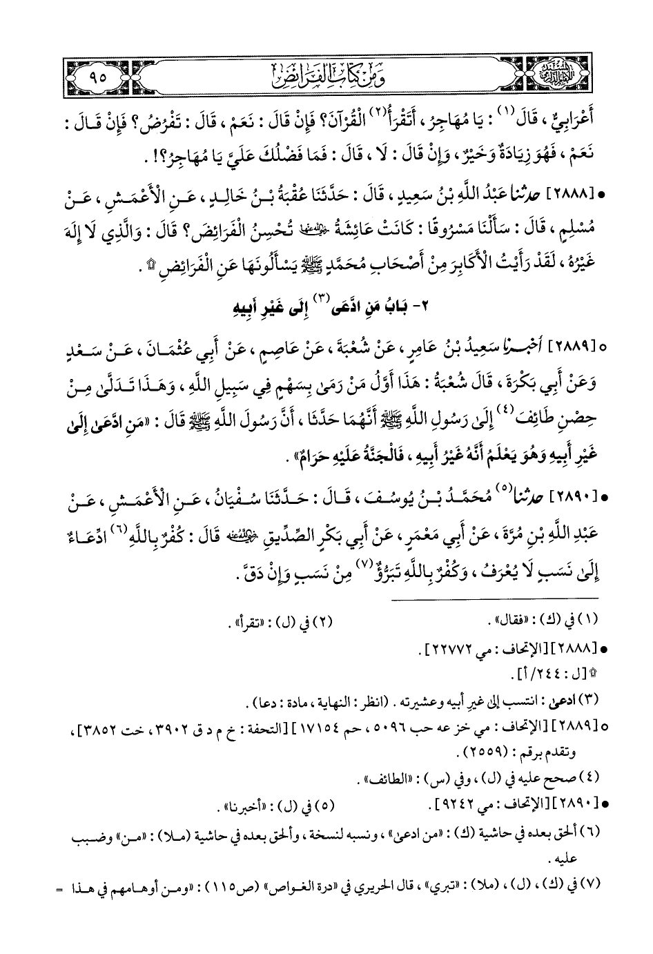 2890- حَدَّثَنَا مُحَمَّدُ بْنُ يُوسُفَ, قَالَ: حَدَّثَنَا سُفْيَانُ, عَنِ الأَعْمَشِ, عَنْ عَبْدِ اللهِ بْنِ مُرَّةَ, عَنْ أَبِي مَعْمَرٍ, عَنْ أَبِي بَكْرٍ الصِّدِّيقِ رَضِيَ اللهُ عَنْهُ, قَالَ: كُفْرٌ بِاللهِ ادِّعَاءٌ إِلَى نَسَبٍ لاَ يُعْرَفُ, وَكُفْرٌ بِاللهِ تَبَرُّؤٌ مِنْ نَسَبٍ وَإِنْ دَقَّ (1).
