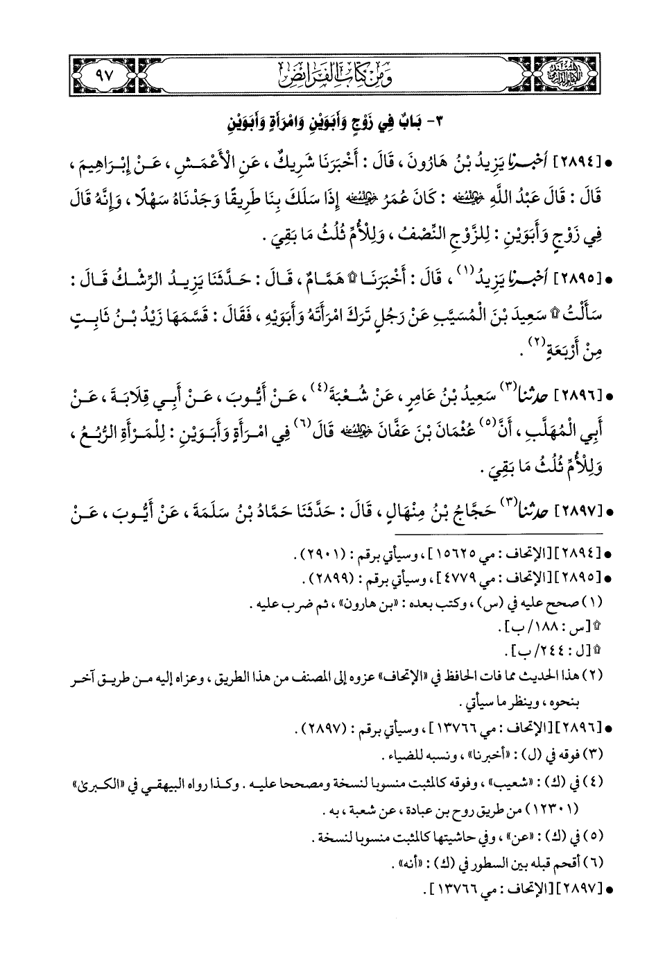 2895- أَخبَرَنا يَزِيدُ, قَالَ: أَخبَرَنا هَمْامٌ, قَالَ: حَدَّثَنَا يَزِيدُ الرِّشْكُ, قَالَ: سَأَلْتُ سَعِيدَ بْنَ الْمُسَيَّبِ عَنْ رَجُلٍ تَرَكَ امْرَأَتَهُ وَأَبَوَيْهِ, فَقَالَ: قَسَّمَهَا زَيْدُ بْنُ ثَابِتٍ مِنْ أَرْبَعَةٍ (1).