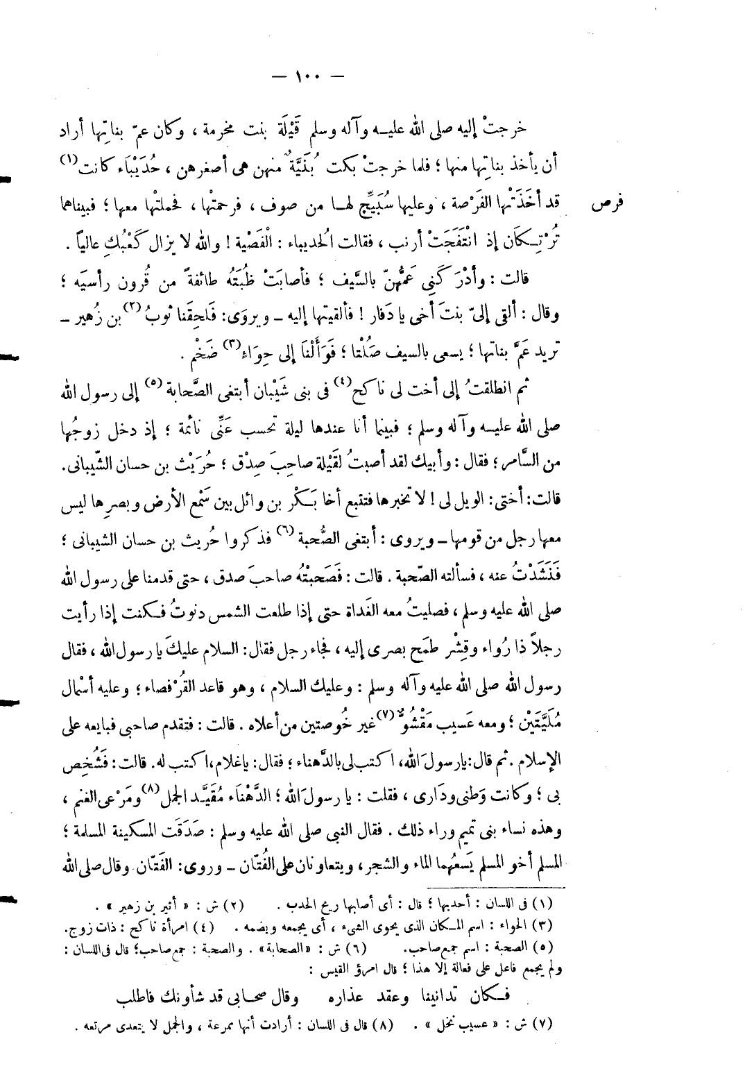 خرجت إِلَيْهِ صلى الله عَلَيْهِ وَسلم قيلة بنت مخرمَة وَكَانَ عَم بناتها أَرَادَ أَن يَأْخُذ بناتها مِنْهَا فَلَمَّا خرجت بَكت بنيَّة مِنْهُنَّ هِيَ أصغرهن حديباء كَانَت قد أَخَذتهَا الفرصة وَعَلَيْهَا سبيج لَهَا من صوف فرحمتها فحملتها مَعهَا فبيناهما ترتكان إِذْ انتفجت أرنب فَقَالَت الحديباء: الفصية وَالله لَا يزَال كعبك عَالِيا. قَالَت: وأدركني عمهن بِالسَّيْفِ فأصابت ظبته طَائِفَة من قُرُون رأسيه وَقَالَ: ألقِي إِلَيّ بنت أخي يَا دفار فألقيتها إِلَيْهِ ويروى: فلحقنا ثوب بن زُهَيْر تُرِيدُ عَم بناتها يسْعَى بِالسَّيْفِ صَلتا فوألنا إِلَى حَوَّاء ضخم. ثمَّ انْطَلَقت إِلَى أُخْت لي ناكح فِي بني شَيبَان أَبْتَغِي الصَّحَابَة إِلَى رَسُول الله صلى الله عَلَيْهِ وَسلم فَبَيْنَمَا أَنا عِنْدهَا لَيْلَة تحسب عني نَائِمَة إِذْ دخل زَوجهَا من السامر فَقَالَ: وَأَبِيك لقد أصبت لقيلة صَاحب صدق حُرَيْث بن حسان الشَّيْبَانِيّ. قَالَت: أُخْتِي: الويل لي لَا تخبرها فتتبع أَخا بكر بن وَائِل بَين سمع الأَرْض وبصرها لَيْسَ مَعهَا رجل من قَومهَا ويروى: أَبْتَغِي الصُّحْبَة فَذكرُوا حُرَيْث بن حسان الشَّيْبَانِيّ فنشدت عَنهُ فَسَأَلته الصُّحْبَة. قَالَت: فصحبته صَاحب صدق حَتَّى قدمنَا على رَسُول الله صلى الله عَلَيْهِ وَسلم فَصليت مَعَه الْغَدَاة حَتَّى إِذا طلعت الشَّمْس دَنَوْت فَكنت إِذا رَأَيْت رجلا ذَا رواء وقشر طمح بَصرِي إِلَيْهِ فجَاء رجل فَقَالَ: السَّلَام عَلَيْك يَا رَسُول الله فَقَالَ رَسُول الله صلى الله عَلَيْهِ وَسلم: وَعَلَيْك السَّلَام وَهُوَ قَاعد القرفصاء وَعَلِيهِ أسمال مليَّتين وَمَعَهُ عسيب مقشو غير خوصتين من أَعْلَاهُ. قَالَت: فَتقدم صَاحِبي فَبَايعهُ على الْإِسْلَام. ثمَّ قَالَ: يَا رَسُول الله اكْتُبْ لي بالدهناء فَقَالَ: يَا غُلَام اكْتُبْ لَهُ. قَالَت: فشخص بِي وَكَانَت وطني وداري فَقلت: يَا رَسُول الله الدهناء مقيَّد الْجمل ومرعى الْغنم وَهَذِه نسَاء بني تَمِيم وَرَاء ذَلِك. فَقَالَ النَّبِي صلى الله عَلَيْهِ وَسلم: صدقت المسكينة الْمسلمَة الْمُسلم أَخُو الْمُسلم يسعهما المَاء وَالشَّجر ويتعاونان على الفتان ورى: الفتان. وَقَالَ صلى الله