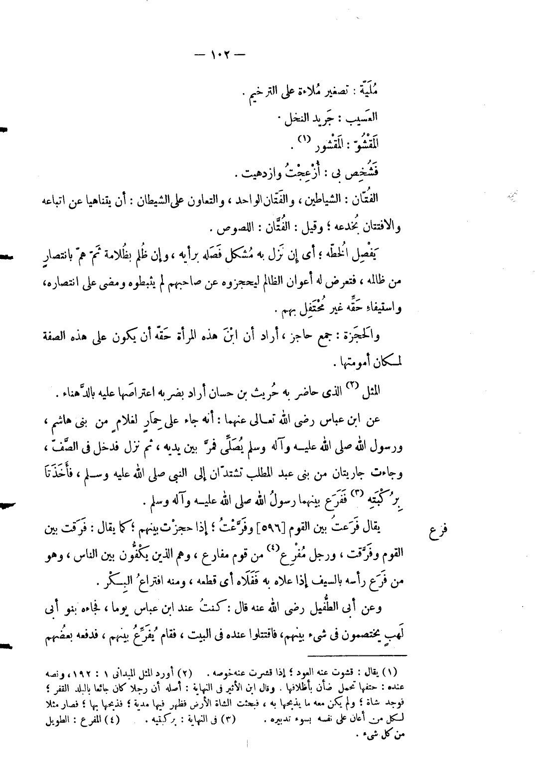 فرع عَن ابْن عَبَّاس رَضِي الله تَعَالَى عَنْهُمَا: أَنه جَاءَ على حمَار لغلام من بني هَاشم وَرَسُول الله صلى الله عَلَيْهِ وَسلم يُصَلِّي فَمر بَين يَدَيْهِ ثمَّ نزل فَدخل فِي الصَّف وَجَاءَت جاريتان من بني عبد الْمطلب تشتدان إِلَى النَّبِي صلى الله عَلَيْهِ وَسلم فأخذتا بركبته ففرع بَينهمَا رَسُول الله صلى الله عَلَيْهِ وَسلم. يُقَال فرعت بَين الْقَوْم وفرَّعت إِذا حجزت بَينهم كَمَا يُقَال: فرقت بَين الْقَوْم وَفرقت وَرجل مُفَرع من قوم مفارع وهم الَّذين يكفُّون بَين النَّاس وَهُوَ من فرع رَأسه بِالسَّيْفِ إِذا علاهُ بِهِ ففلاه أَي قطعه وَمِنْه افتراع الْبكر. وَعَن أبي الطُّفَيْل رَضِي الله عَنهُ قَالَ: كنت عِنْد ابْن عَبَّاس يَوْمًا فَجَاءَهُ بَنو أبي لَهب يختصمون فِي شَيْء بَينهم فَاقْتَتلُوا عِنْده فِي الْبَيْت فَقَامَ يفرِّع بَينهم فَدفعهُ بَعضهم.