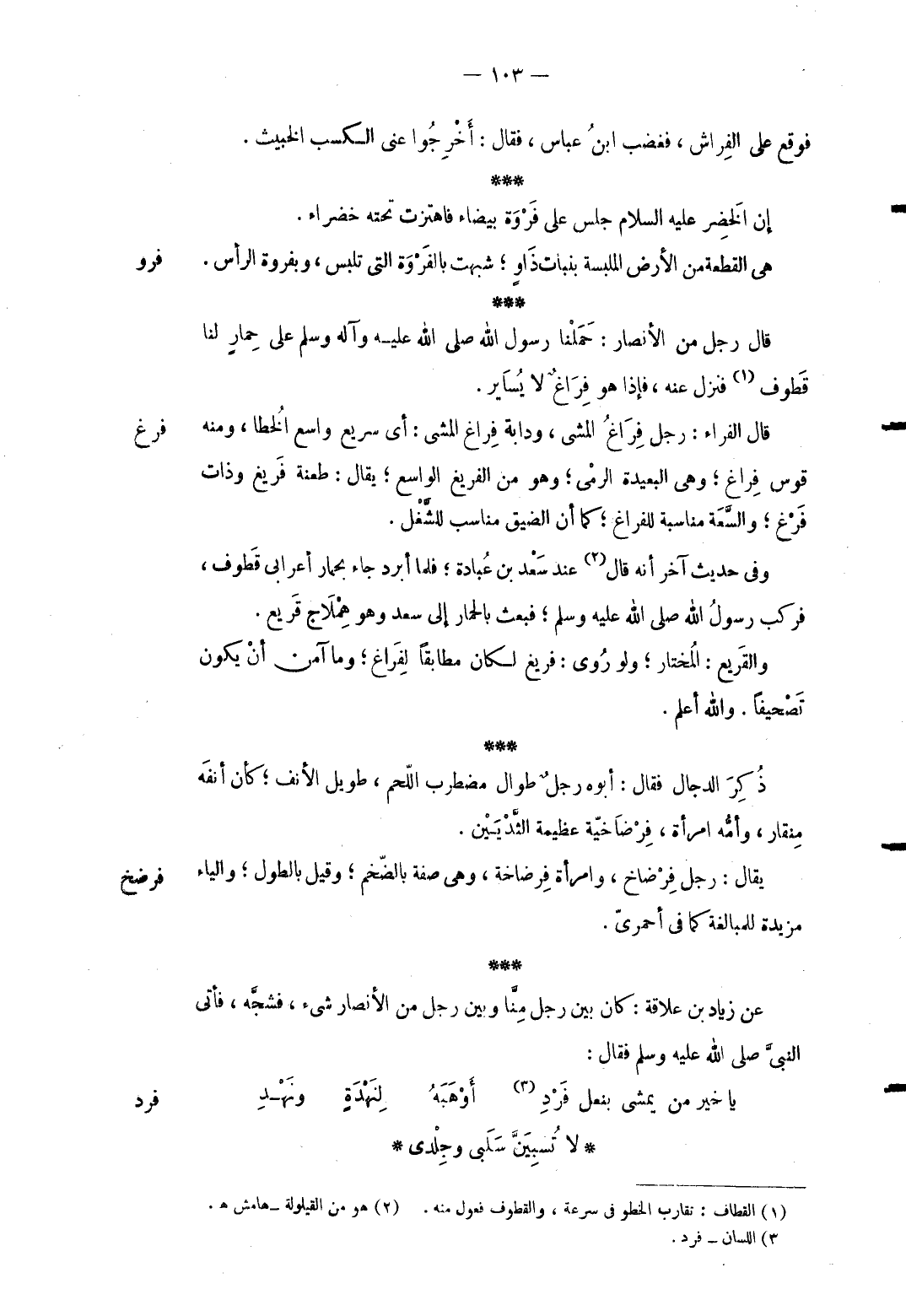 فرغ قَالَ رجل من الْأَنْصَار: حملنَا رَسُول الله صلى الله عَلَيْهِ وَسلم على حمَار لنا قطوف فَنزل عَنهُ فَإِذا هُوَ فرَاغ لَا يُساير. قَالَ الْفراء: رجل فرَاغ الْمَشْي ودابة فرَاغ الْمَشْي: أَي سريع وَاسع الخطا وَمِنْه قَوس فرَاغ وَهِي الْبَعِيدَة الرَّمْي وَهُوَ من الفريغ الْوَاسِع يُقَال: طعنه فريغ وَذَات فرغ وَالسعَة مُنَاسبَة للفراغ كَمَا أَن الضّيق مُنَاسِب للشَّغل. وَفِي حَدِيث آخر أَنه قَالَ عِنْد سعد بن عبَادَة فَلَمَّا أبرد جَاءَ بِحِمَار أَعْرَابِي قطوف فَركب رَسُول الله صلى الله عَلَيْهِ وَسلم فَبعث الْحمار إِلَى سعد وَهُوَ هملاج قريع. والقريع: الْمُخْتَار وَلَو روى: فريغ لَكَانَ مطابقاً لفراغ وَمَا آمن أَن يكون تصحيفا. وَالله أعلم.