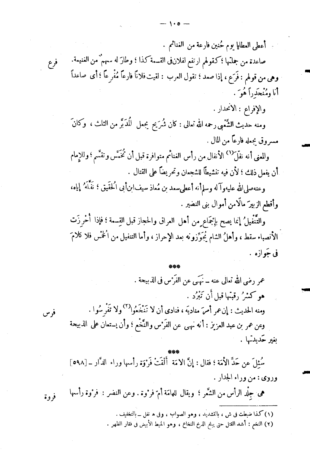 فرع أعْطى العطايا يَوْم حنين فارعة من الْغَنَائِم. صاعدة من جُمْلَتهَا كَقَوْلِهِم ارْتَفع لفُلَان فِي الْقِسْمَة كَذَا وطار لَهُ سهم من الْغَنِيمَة. وَهِي من قَوْلهم: فرع إِذا صعد تَقول الْعَرَب: لقِيت فلَانا فارعاً مفرعاً أَي صاعداً أَنا ومنحدراً هُوَ. والإفراع: الانحدار. وَمِنْه حَدِيث الشّعبِيّ رَحمَه الله تَعَالَى: كَانَ شُرَيْح يَجْعَل الْمُدبر من الثُّلُث وَكَانَ مَسْرُوق يَجعله فارعاً من المَال. وَالْمعْنَى أَنه نفل الْأَنْفَال من رَأس الْغَنَائِم متوافرة قبل أَن تخمس وتقسم وَللْإِمَام أَن يفعل ذَلِك لِأَن فِيهِ تنشيطاً للشجعان وتحريضاً على الْقِتَال. وَعنهُ صلى الله عَلَيْهِ وَسلم أَنه أعْطى سعد بن معَاذ سيف الدّين ابْن أبي الْحقيق نفله إِيَّاه وأقطع الزبير مَالا من أَمْوَال بني النَّضِير. والتنفيل إِنَّمَا يَصح بِإِجْمَاع من أهل الْعرَاق والحجاز قبل الْقِسْمَة فَإِذا أُحرزت الْأَنْصِبَاء سقط وَأهل الشَّام يجوزونه بعد الْإِحْرَاز وَأما التَّنْفِيل من الخُمس فَلَا كَلَام فِي جَوَازه.