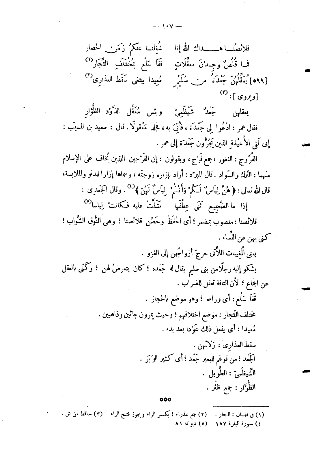 يُعَقِّلُهُنّ جَعْدَةُ من سُلَيْمٍ ... مُعِيدا يَبْتَغِي سقط العذاري ... [ويروى] : ... يعقلهن جعد شيظمي ... وبنس مُعَقِّل الذَّوْد الظُّؤارِ ... فَقَالَ عمر: ادعوا لي جعدة فأُتي بِهِ فجلد معقولاً. قَالَ سعيد بن الْمسيب: إِنِّي لفي الأُغيلمة الَّذين يجرونَ جعدة إِلَى عمر. الْفروج: الثغور جمع فرج وَيَقُولُونَ إِن الفرجين اللَّذين يُخاف على الْإِسْلَام مِنْهُمَا: التّرْك والسواد. قَالَ الْمبرد: أَرَادَ بِإِزَارِهِ زَوجته وسماها إزارا للدنو والملابسة قَالَ الله تَعَالَى: {هُنَّ لِبَاسٌ لَكُمْ وَأَنْتُمْ لِبَاسٌ لَهُنّ} . وَقَالَ الْجَعْدِي: ... إِذا مَا الضَّجِيع ثَنَى عِطْفَها ... تَثَنَّتْ عَلَيْهِ فكانتْ لِباسا ... قلائصنا: مَنْصُوب بمضمر أَي احفظ وحصِّن قلائصنا وَهِي النوق الشَّواب كنى بِهن عَن النِّسَاء. يَعْنِي المغيبات اللَّاتِي خرج أَزوَاجهنَّ إِلَى الْغَزْو. يشكو إِلَيْهِ رجلا من بني سليم يُقَال لَهُ جعده كَانَ يتَعَرَّض لَهُنَّ وكنى بِالْعقلِ عَن الْجِمَاع لِأَن التاقة تعقل للضراب. قفا سلع: أَي وَرَاءه وَهُوَ مَوضِع بالحجاز. مُخْتَلف التُّجَّار: مَوضِع اخْتلَافهمْ وَحَيْثُ يَمرونَ جائين وذاهبين. معيدا: أَي يفعل ذَلِك عودا بعد بَدْء. سقط العذاري: زلاتهن. الْجَعْد من قَوْلهم للبعير جعد أَي كثير الْوَبر. الشيظمي: الطَّوِيل. الظؤار: جمع ظئر.