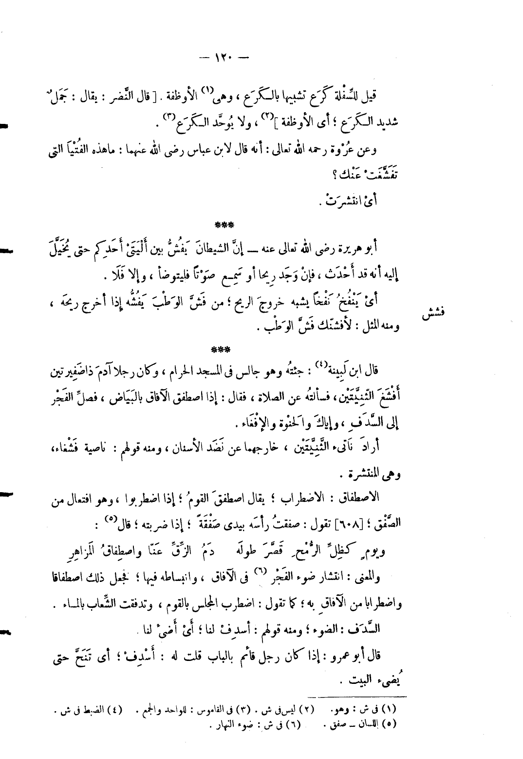 فشش أَبُو هُرَيْرَة رَضِي الله تَعَالَى عَنهُ إِن الشَّيْطَان يفشُّ بَين أليتي أحدكُم حَتَّى يخيل إِلَيْهِ أَنه قد أحدث فَإِن وجد ريحًا أَو سمع صَوتا فَليَتَوَضَّأ وَإِلَّا فَلَا. أَي يتفخ نفخا يشبه خُرُوج الرّيح من فش الوطب يفشه إِذا أخرج رِيحه وَمِنْه الْمثل: لأفشنك فشَّ الوطب. قَالَ ابْن لبينة: جِئْته وَهُوَ جَالس فِي الْمَسْجِد الْحَرَام وَكَانَ رجلا آدم ذَا ضفيرتين أفشغ الثنيتين فَسَأَلته عَن الصَّلَاة فَقَالَ: إِذا اصطفق الْآفَاق بالبياض فصلِّ الْفجْر إِلَى السدف وَإِيَّاك والحنوة والإفغاء. أَرَادَ ناتئ الثنيتين خارجهما عَن نضد الْأَسْنَان وَمِنْه قَوْلهم: نَاصِيَة فشغاء وَهِي المنتشرة. الاصطفاق: الِاضْطِرَاب يُقَال اصطفق الْقَوْم إِذا اضْطَرَبُوا وَهُوَ افتعال من الصفق تَقول: صفقت رَأسه بيَدي صَفْقَة إِذا ضَربته قَالَ: ... ويومٍ كظِلِّ الرُّمْحِ قَصِّرَ طولَه ... دَمُ الزِّقِّ عَنّا واصطِفاقُ المَزاهِرِ ... وَالْمعْنَى: انتشار ضوء الْفجْر فِي الْآفَاق وانبساطه فِيهَا فَجعل ذَلِك اصطفاقا واضطرابا من الْآفَاق بِهِ كَمَا تَقول: اضْطربَ الْمجْلس بالقوم وتدفقت الشِّعاب بِالْمَاءِ. السَّدف: الضَّوْء وَمِنْه قَوْلهم: أسدف لنا أَي أضيء لنا. قَالَ أَبُو عَمْرو: إِذا كَانَ رجل قَائِم بِالْبَابِ قلت لَهُ: أسدف أَي تنحَّ حَتَّى يضيء الْبَيْت.
