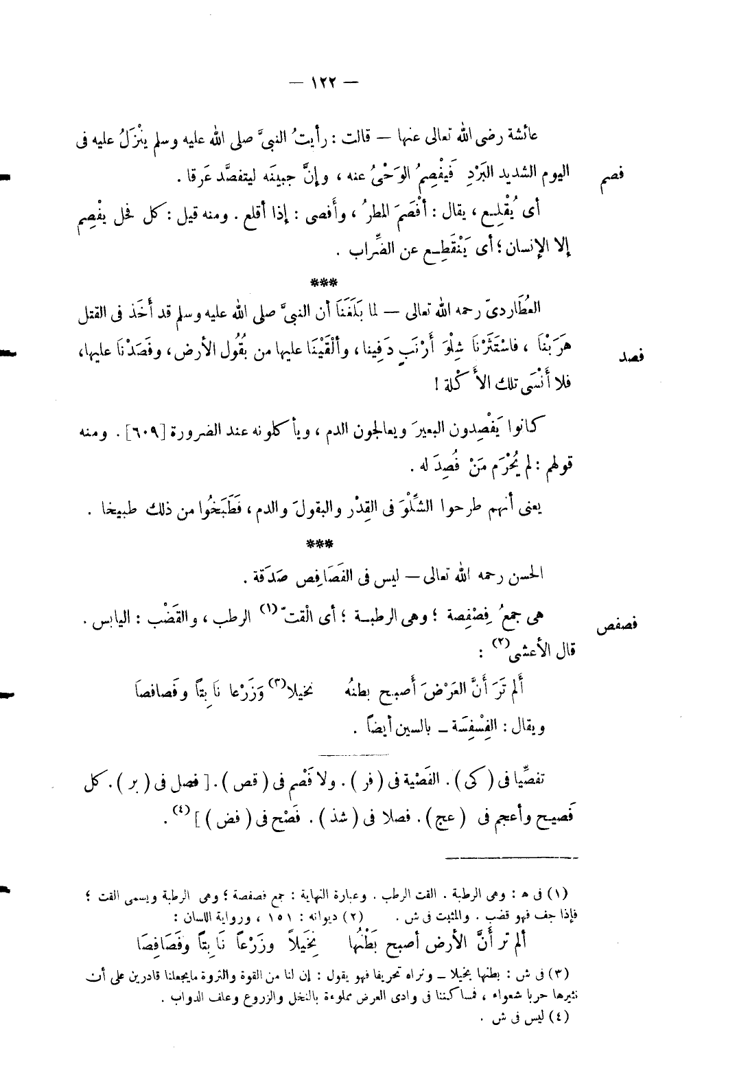 فصفص الْحسن رَحمَه الله تَعَالَى لَيْسَ فِي الفصافص صَدَقَة. هِيَ جمع فصفصة وَهِي الرّطبَة أَي الفت الرطب والقضب: الْيَابِس. قَالَ الْأَعْشَى: ... أَلم تَرَ أَنَّ العَرْضَ أَصبح بطنُه ... نخيلا وَزَرْعا نَابِتاً وفصافصا ... وَيُقَال: الفسفسة بِالسِّين أَيْضا.