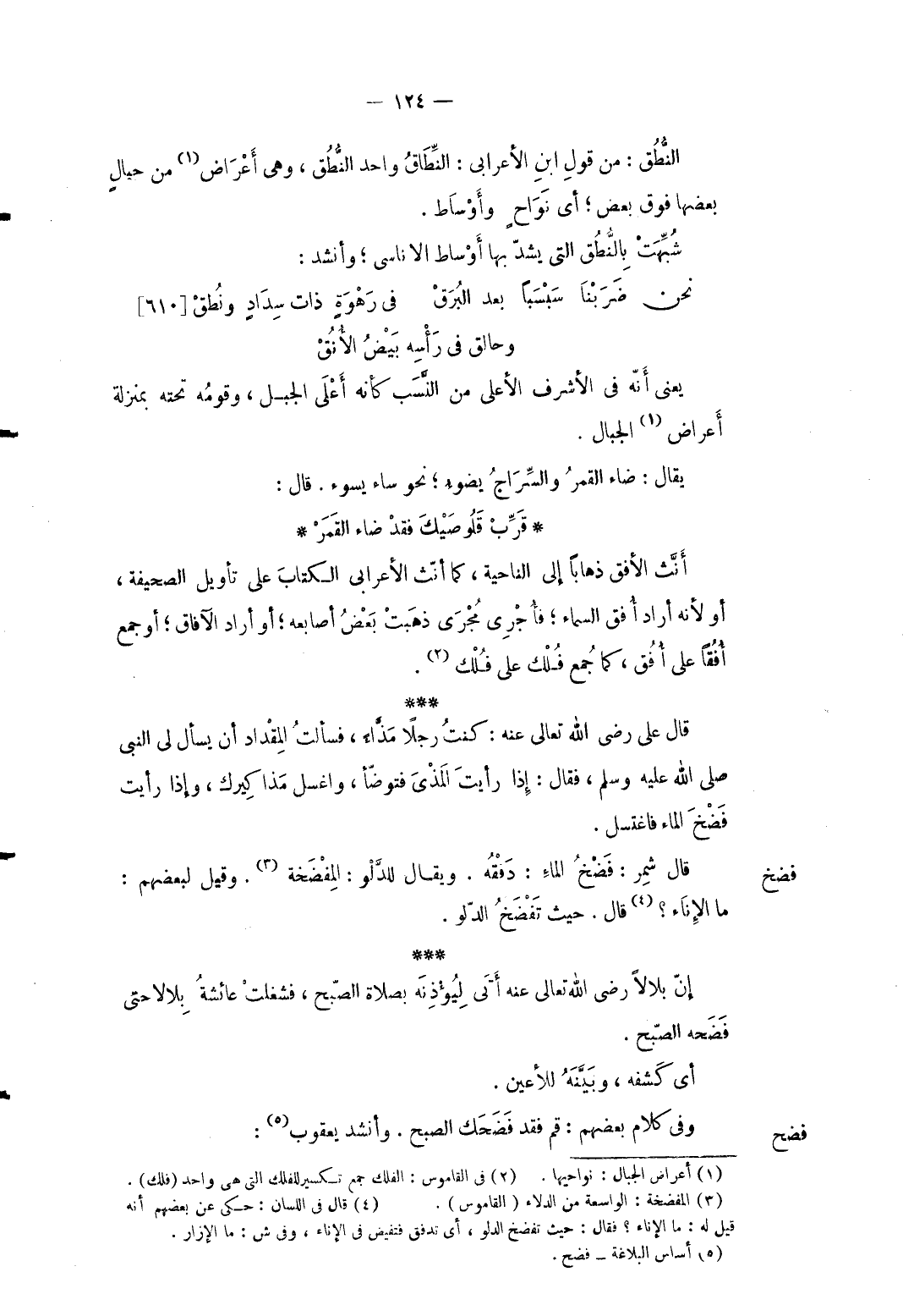 وحالق فِي رَأْسِه بَيْضُ الأُنُقْ ... يَعْنِي أَنه فِي الْأَشْرَف الْأَعْلَى من النّسَب كَأَنَّهُ أَعلَى الْجَبَل وَقَومه تَحْتَهُ بِمَنْزِلَة أَعْرَاض الْجبَال. يُقَال: ضاء الْقَمَر والسراج يضوء نَحْو سَاءَ يسوء. قَالَ: ... قَرِّبْ قَلُوصَيْكَ فقدْ ضاء القَمَرْ ... أنَّث الْأُفق ذَهَابًا إِلَى النَّاحِيَة كَمَا أنَّث الْأَعرَابِي الْكتاب على تَأْوِيل الصَّحِيفَة أَو لِأَنَّهُ أَرَادَ أُفق السَّمَاء فأُجري مجْرى ذهبت بعض أَصَابِعه أَو أَرَادَ الْآفَاق أَو جمع أُفقاً على أُفق كَمَا جمع فلك على فلك.
