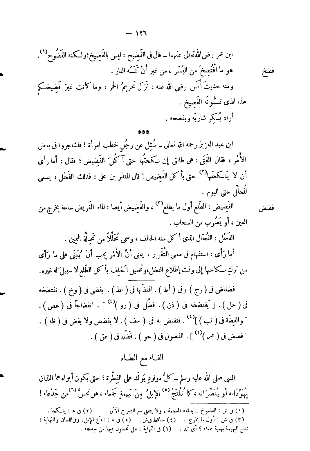 فضَض ابْن عبد الْعَزِيز رَحمَه الله تَعَالَى سُئل عَن رجل خطب امْرَأَة فتشاجروا فِي بعض الْأَمر فَقَالَ الْفَتى: هِيَ طَالِق إِن نكحتها حَتَّى آكل الفضيض فَقَالَ: أما رأى أَن لَا ينْكِحهَا حَتَّى يَأْكُل الفضيض قَالَ الْمُنْذر بن عَليّ: فَذَلِك الْفَحْل يُسمى الْمُحَلّل حَتَّى الْيَوْم. الفضيض: الطّلع أَو مَا يطلع والفضيض أَيْضا: المَاء الْغَرِيض سَاعَة يخرج من الْعين أَو يصوب من السَّحَاب. الْفَحْل: الفحال الَّذِي أكل مِنْهُ الْحَالِف وَسمي محللا من تَحِلَّة الْيمن. أما رأى: اسْتِفْهَام فِي معنى التَّقْرِير يَعْنِي أَن الْأَمر يجب أَن يبْنى على مَا رأى من ترك نِكَاحهَا إِلَى وَقت إطلاع النّخل وَتَحْلِيل الْحلف بِأَكْل الطّلع لَا سَبِيل لَهُ غَيره.