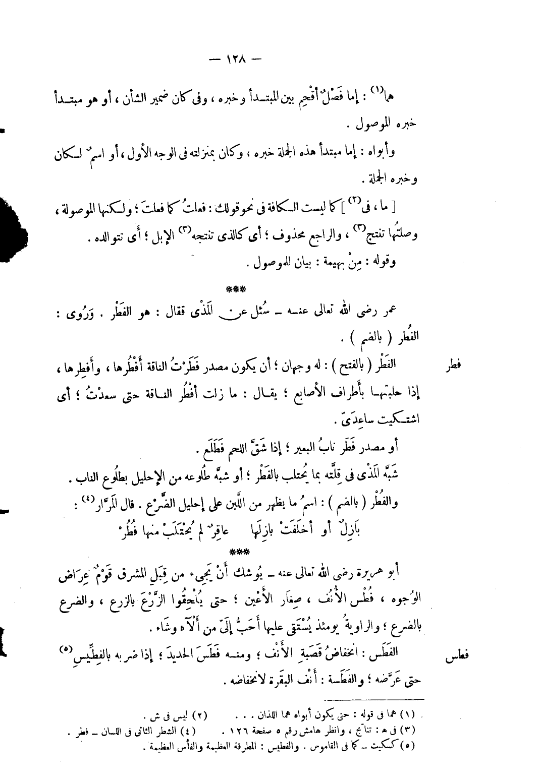 فطر عمر رَضِي الله تَعَالَى عَنهُ سُئل عَن المذى فَقَالَ: هُوَ الْفطر. وروى: الفُطر (بِالضَّمِّ) . الْفطر (بِالْفَتْح) : لَهُ وَجْهَان: أَن يكون مصدر فطرت النَّاقة أفْطُرها وأَفطِرها إِذا حلبتها بأطراف الْأَصَابِع يُقَال: مَا زلت أفطر النَّاقة حَتَّى سعدت أَي اشتكيت ساعدي. أَو مصدر فطر نَاب الْبَعِير إِذا شقَّ اللَّحْم فطلع. شبه المذى فِي قلته بِمَا يحتلب بِالْفطرِ أَو شبه طلوعه من الإحليل بِطُلُوع الناب. وَالْفطر (بِالضَّمِّ) : اسْم مَا يظْهر من اللَّبن على إحليل الضَّرع. قَالَ المرار: ... بَازِلٌ أَو أخلَفَتْ بازلها ... عَاقِر لم يحتلب مِنْهَا فطر ...