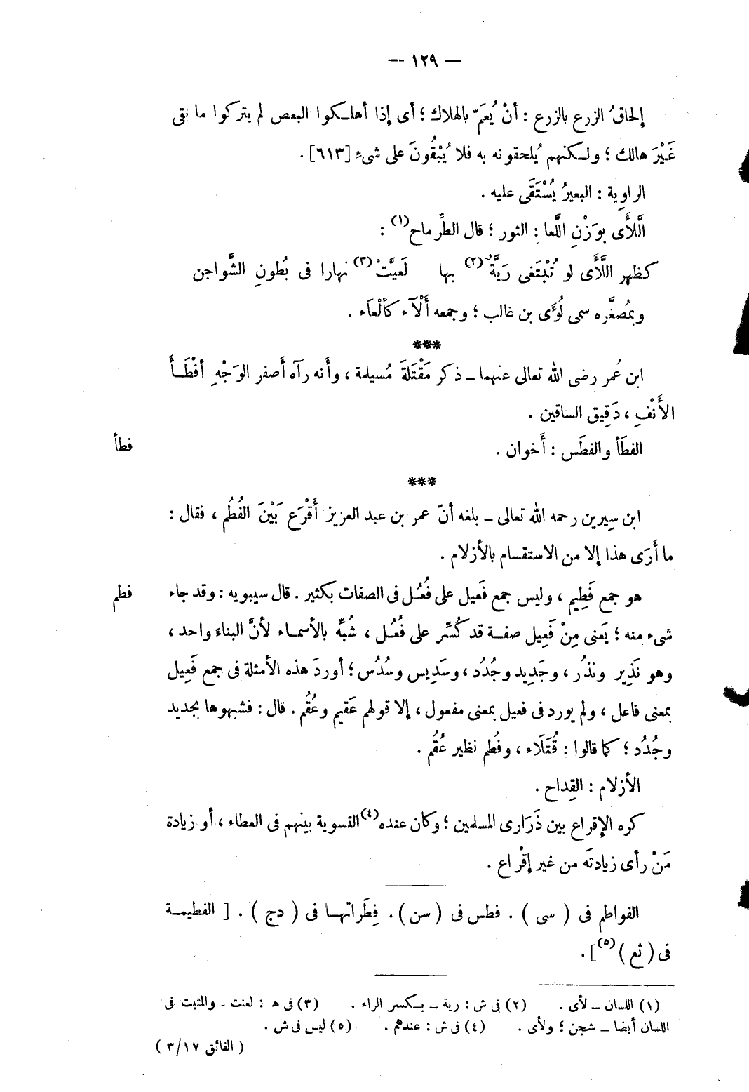إِلْحَاق الزَّرْع بالزرع: أَن يعم بِالْهَلَاكِ أَي إِذا أهلكوا الْبَعْض لم يتْركُوا مَا بَقِي غير هَالك وَلَكنهُمْ يلحقونه بِهِ فَلَا يبقون على شَيْء. الراوية: الْبَعِير يَسْتَقِي عَلَيْهِ. اللأى بِوَزْن اللعا: الثور فِي الطرماح: ... كَظهر الَّلأَى لَو تُبْتَغي رَيَّةٌ بهَا ... لَعَّيتْ نَهَارا فِي بُطونِ الشَّواجن ... وبمصغره سمي لؤَي بن غَالب وَجمعه ألآء كألعاء.
