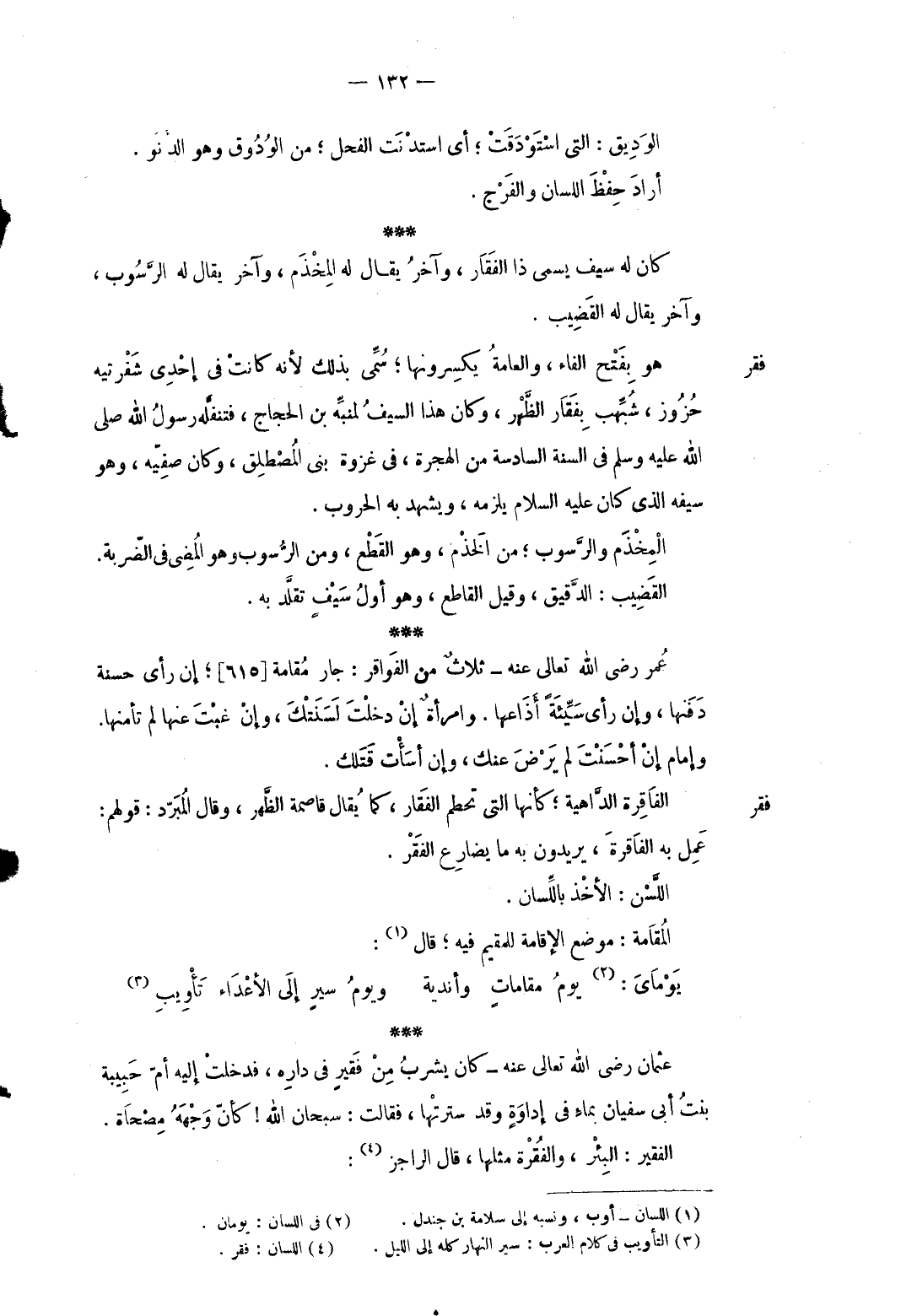 فقر كَانَ لَهُ سيف الدّين يُسمى ذَا الفقار وَآخر يُقَال لَهُ المخذم وَآخر يُقَال لَهُ الرَّسوب وَآخر يُقَال لَهُ الْقَضِيب. هُوَ بِفَتْح الْفَاء والعامة يكسرونها سمي بذلك لِأَنَّهُ كَانَت فِي إِحْدَى شفرتيه حروز شبهب بفقار الظّهْر وَكَانَ هَذَا السَّيْف لمنبه بن الْحجَّاج فتنفله رَسُول الله صلى الله عَلَيْهِ وَسلم فِي السّنة السَّادِسَة من الْهِجْرَة فِي غَزْوَة المصطلق وَكَانَ صَفيه وَهُوَ سَيْفه الَّذِي كَانَ عَلَيْهِ السَّلَام يلْزمه وَيشْهد بِهِ الحروب. المخذم والرَّسوب من الخذم وَهُوَ الْقطع وَمن الرَّسوب وَهُوَ الْمُضِيّ فِي الضَّرْبَة الْقَضِيب: الدَّقِيق وَقيل الْقَاطِع وَهُوَ أول سيف تقلد بِهِ.