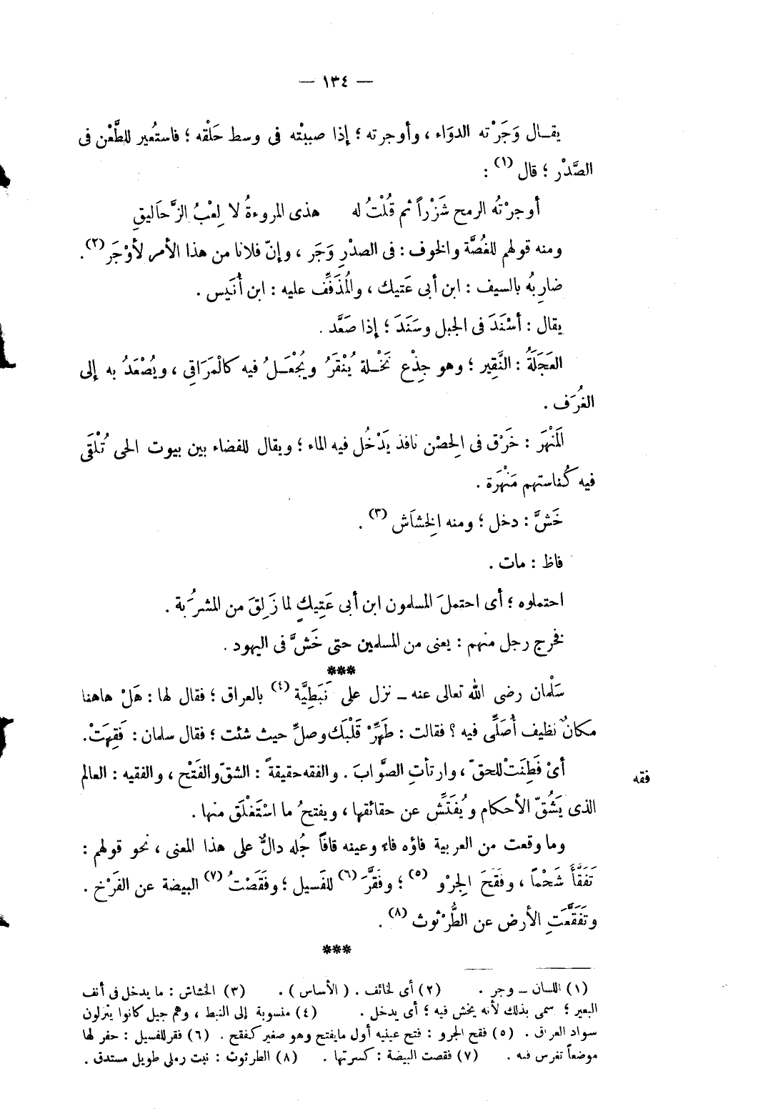 يُقَال وجرته الدَّوَاء وأوجرته إِذا صببته فِي وسط حلقه فاستُعير لِلطَّعْنِ فِي الصَّدْر قَالَ: ... أوجرْتُه الرمْح شَزْراً ثمَّ قُلْتُ لَهُ ... هذي المروءةُ لَا لِعْبُ الزَّحَاليقِ ... وَمِنْه قَوْلهم للغصة وَالْخَوْف: فِي الصَّدْر وجر وَإِن فلَانا من هَذَا الْأَمر لأوجر. ضاربه بِالسَّيْفِ: إِن أبي عتِيك والمذفَّف عَلَيْهِ: ابْن أُنيس. يُقَال: أسْند فِي الْجَبَل وَسَنَد إِذا صعد. العجلة: النقير وَهُوَ جذع نَخْلَة ينقر وَيجْعَل فِيهِ كالمراقي ويُصعد بِهِ إِلَى الغرف. المنهر: خرق فِي الْحصن نَافِذ يدْخل فِيهِ المَاء وَيُقَال للفضاء بَين بيُوت الْحَيّ تُلقى فِيهِ كناستهم منهرة. خشَّ: دخل وَمِنْه الخشاش. فاظ: مَاتَ. احتملوه أَي احْتمل الْمُسلمُونَ ابْن أبي عتِيك لما زلق من الْمشْربَة. فَخرج رجل مِنْهُم: يَعْنِي من الْمُسلمين حَتَّى خشَّ فِي الْيَهُود.