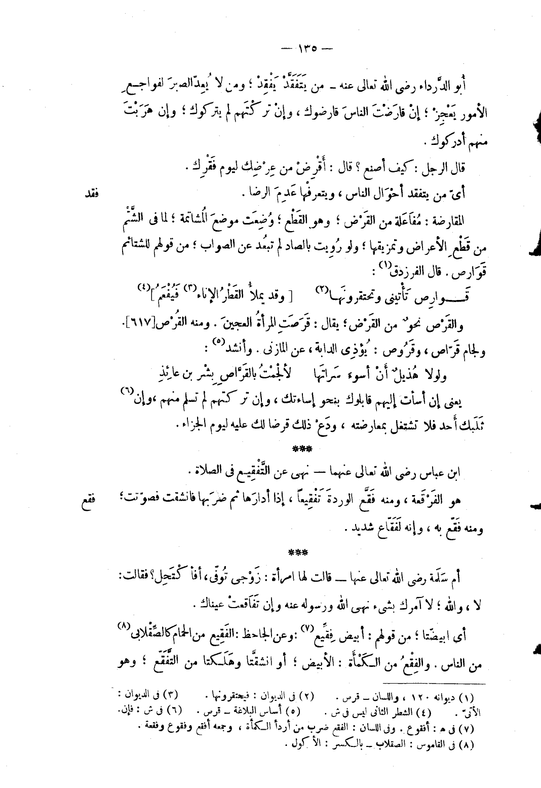 فقد أَبُو الدَّرْدَاء رَضِي الله تَعَالَى عَنهُ من يتفقد يفقد وَمن لَا يعد الصَّبْر لفواجع الْأُمُور يعجز إِن قارضت النَّاس قارضوك وَإِن تَركتهم لم يتركوك وَإِن هربت مِنْهُم أدركوك. قَالَ الرجل: كَيفَ أصنع قَالَ: أقْرض من عرضك ليَوْم فقرك. أَي من يتفقد أَحْوَال النَّاس ويتعرفها عدم الرِّضَا. المقارضة: مفاعلة من الْقَرْض وَهُوَ الْقطع وضعت مَوضِع المشاتمة لما فِي الشتم من قطع الْأَعْرَاض وتمزيقها وَلَو رويت بالصَّاد لم تبتعد عَن الصَّوَاب من قَوْلهم للشتائم قوارص. قَالَ الفرزدق: ... قَوارِص تَأْتيني وتحتقرونَها ... وَقد يملأُ القَطْرُ الْإِنَاء فَيُفَعَمُ ... والقرص نَحْو من الْقَرْض يُقَال: قرصت الْمَرْأَة الْعَجِين. وَمِنْه القرص ولجام قرّاص وقروص: يُؤْذِي الدَّابَّة عَن الْمَازِني. وَأنْشد: ... وَلَوْلَا هُذيلٌ أَنْ أسوءَ سَراتَها ... لألْجمْتُ بالقَرَّاصِ بِشْر بن عائِذِ ... يَعْنِي إِن أَسَأْت إِلَيْهِم قابلوك بِنَحْوِ إساءتك وَإِن تَركتهم لم تسلم مِنْهُم وَإِن ثلبك أحد فَلَا تشتغل بمعارضته ودع ذَلِك قرضا لَك عَلَيْهِ ليَوْم الْجَزَاء.
