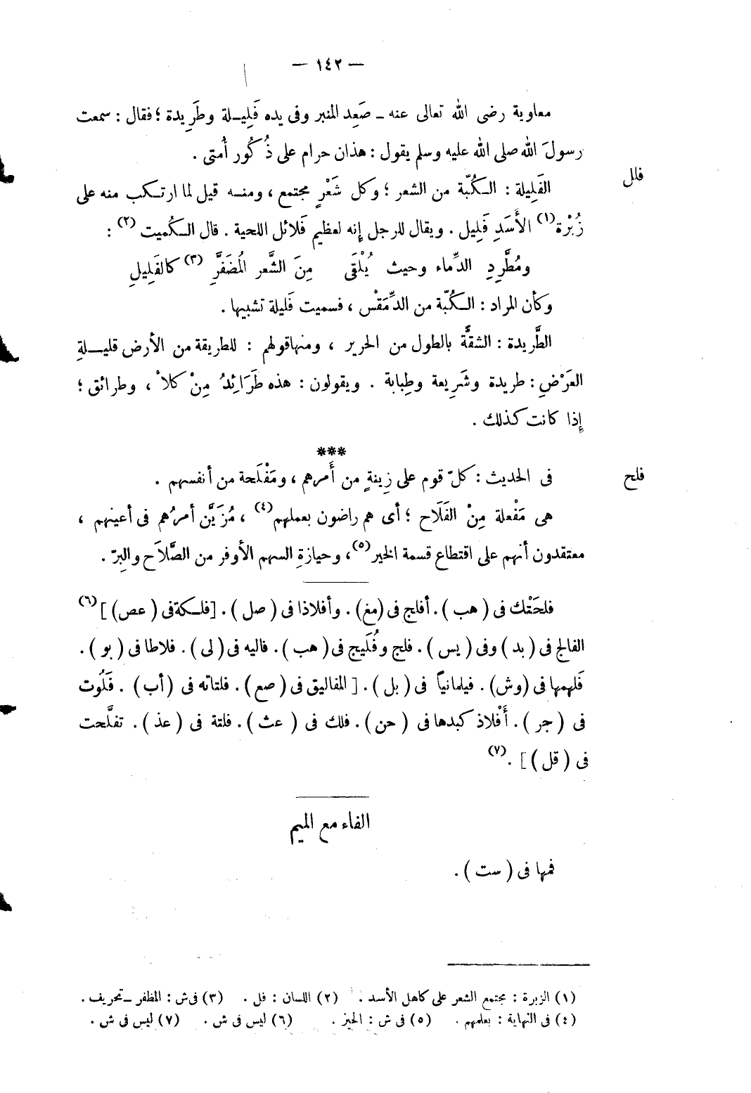 فلل مُعَاوِيَة رَضِي الله تَعَالَى عَنهُ صعد الْمِنْبَر وَفِي يَده فليلة وطريدة فَقَالَ: سَمِعت رَسُول الله صلى الله عَلَيْهِ وَسلم يَقُول: هَذَانِ حرَام على ذُكُور أمتِي. الفليلة: الكبة من الشّعْر وكل شعر مُجْتَمع وَمِنْه قيل لما ارْتكب مِنْهُ على زبرة الْأسد فليل للرجل إِنَّه لعَظيم فلائل اللِّحْيَة. قَالَ الْكُمَيْت: ... ومُطَّرِدِ الدِّماء وَحَيْثُ يُلْقَى ... مِنَ الشَّعر المُضَفَّرِ كالفَلِيلِ ... وَكَأن المُرَاد: الكبة من الدمقس فسميت فليلة تَشْبِيها. الطريدة: الشقة بالطول من الْحَرِير وَمِنْهَا قَوْلهم: للطريقة من الأَرْض قَليلَة الْعرض: طريدة وَشَرِيعَة وطبابة. وَيَقُولُونَ: هَذِه طرائد من كلأ وطرائق إِذا كَانَت كَذَلِك.