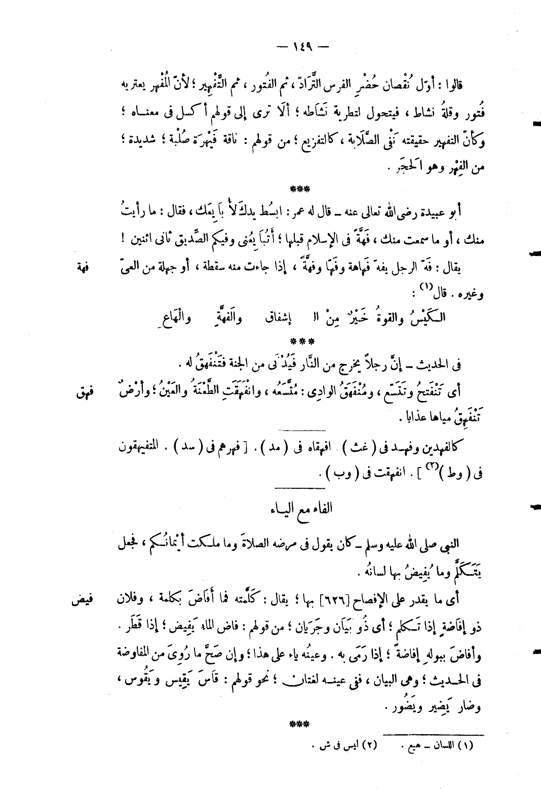 فيض النَّبِي صلى الله عَلَيْهِ وَسلم كَانَ يَقُول فِي مَرضه الصَّلَاة وَمَا ملكت أَيْمَانكُم فَجعل يتَكَلَّم وَمَا يُفيض بهَا لِسَانه. أَي مَا يقدر على الإفصاح بهَا يُقَال: كلمت أَفَاضَ بِكَلِمَة وَفُلَان ذُو إفَاضَة إِذا تكلم أَي ذُو بَيَان وجريان من قَوْلهم: فاض المَاء يفِيض إِذا قطر. وأفاض ببوله إفَاضَة إِذا رمى بِهِ. وعينه يَاء على هَذَا وَإِن صحَّ مَا روى من الْمُفَاوضَة فِي الحَدِيث وَهِي الْبَيَان فَفِي عينه لُغَتَانِ نَحْو قَوْلهم: قَاس يقيس ويقوس وضار يضير ويضور.