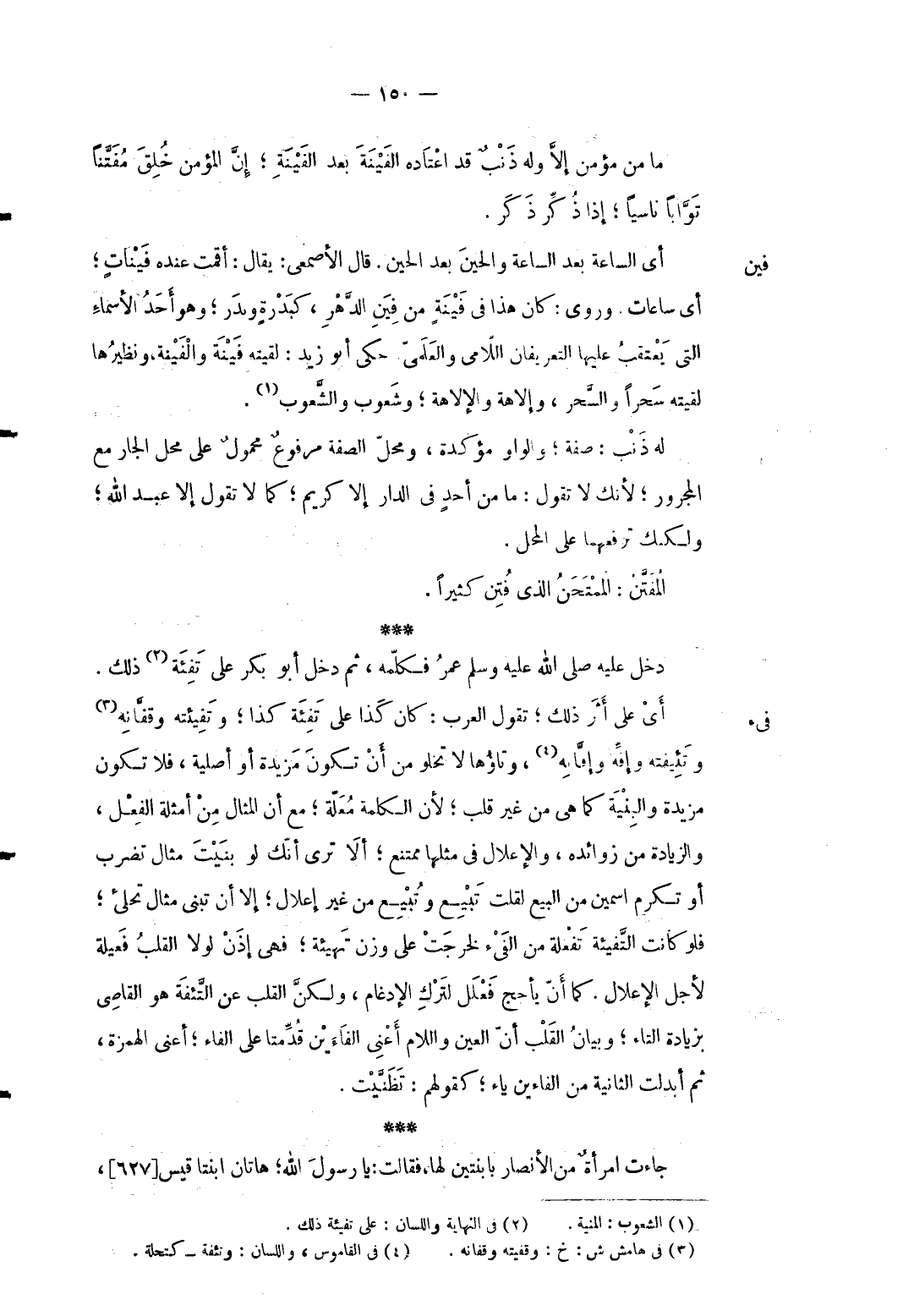 فين مَا من مُؤمن إِلَّا وَله ذَنْب قد اعتاده الفينة بعد الفينة إِن الْمُؤمن خُلق مفتَّنا توَّاباً نَاسِيا إِذا ذُكِّر ذكر. أَي السَّاعَة بعد السَّاعَة والحين بعد الْحِين. قَالَ الْأَصْمَعِي: يُقَال: أَقمت عِنْده فينات أَي سَاعَات. وروى: كَانَ هَذَا فِي فينة من ففين الدَّهْر كبدرة وَبدر وَهُوَ أحد الْأَسْمَاء الَّتِي يعتقب عَلَيْهَا التعريفان اللامي والعلمي. حكى أَبُو زيد: لَقيته فينة والفينة ونظيرها لَقيته سحرًا والسَّحر وإلاهة والإلاهة وشعوب والشَّعوب. لَهُ ذَنْب: صفة وَالْوَاو مُؤَكدَة وَمحل الصّفة مَرْفُوع مَحْمُول على مَحل الْجَار مَعَ الْمَجْرُور لِأَنَّك لَا تَقول: مَا من أحد فِي الدَّار إِلَّا كريم كَمَا لَا تَقول إِلَّا عبد الله وَلَكِنَّك ترفعهما على الْمحل. المفتَّن: الممتحن الَّذِي فتن كثيرا.