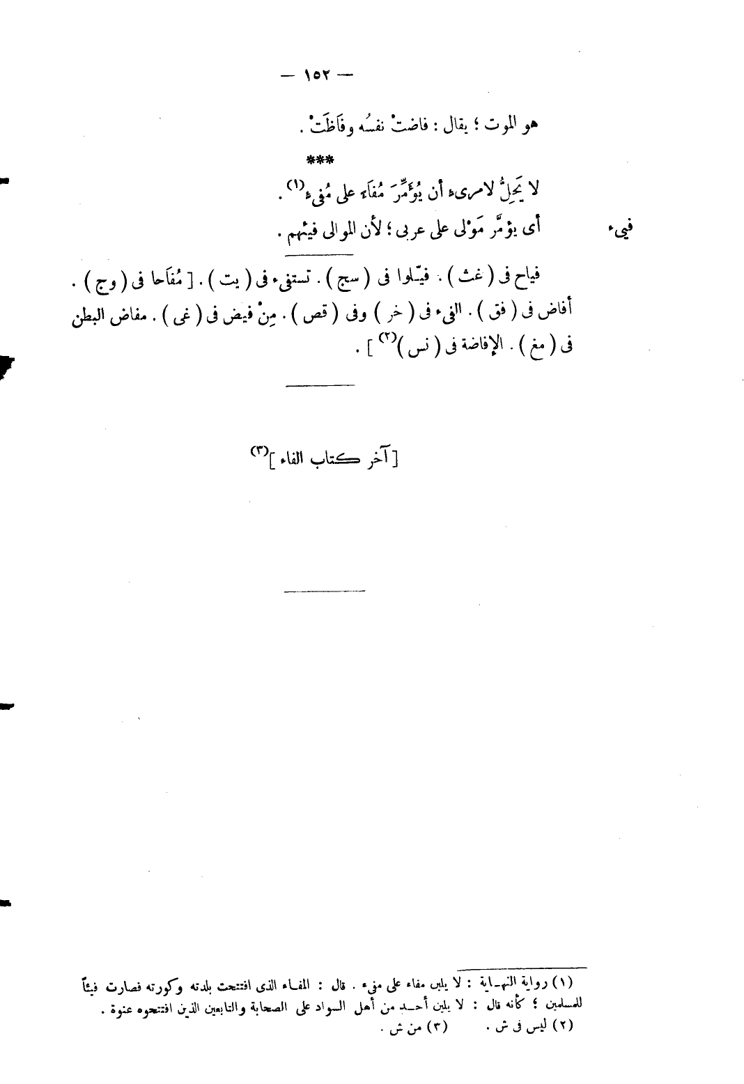 فيئ لَا يحلُّ لامرئ أَن يؤمِّر مفاءً على مفيء. أَي يؤمَّر مولى على عَرَبِيّ لِأَن الموَالِي فيئهم. [آخر كتاب الْفَاء]