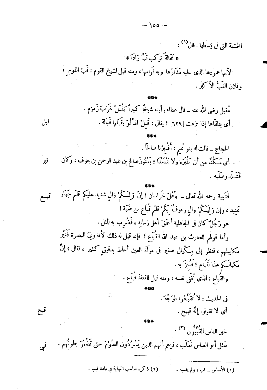 قبع قُتَيْبَة رَحمَه الله تَعَالَى _ يأهل خُرَاسَان إِن وَلِيكُم والٍ شَدِيد عَلَيْكُم قُلْتُمْ جَبَّار عنيد وَإِن وَلِيكُم وَال رءوف بكم قُلْتُمْ قباع بن ضبة هُوَ رجل كَانَ فِي الْجَاهِلِيَّة أَحمَق أهل زَمَانه فَضرب بِهِ الْمثل. وَأما قَوْلهم لِلْحَارِثِ بن عبد الله القُباع فَإِنَّمَا قيل لَهُ ذَلِك لِأَنَّهُ ولي الْبَصْرَة فغيَّر مكاييلهم فَنظر إِلَى مكيال صَغِير فِي مرْآة الْعين أحَاط بدقيق كثير فَقَالَ: إِن مكيالكم هَذَا لقباع فنبز بِهِ. والقباع: الَّذِي يُخفي نَفسه وَمِنْه قيل للقنفذ قباع.