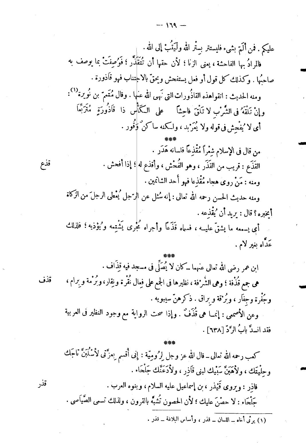 ابْن عمر رَضِي الله تَعَالَى عَنْهُمَا كَانَ لايصلى فِي مَسْجِد فِيهِ قذاف. هِيَ جمع قذفة وَهِي الشرفة نظيرها فِي الْجمع على فعال نقرة ونقار وبرمة وبرام وجفرة وجفار وبرقة وبراق. ذكرهن سِيبَوَيْهٍ. وَعَن الْأَصْمَعِي: إِنَّمَا هِيَ قُذفٌ. وَإِذا صحت الرِّوَايَة مَعَ وجود النظير فِي الْعَرَبيَّة فقد انسد بَاب الرَّد.