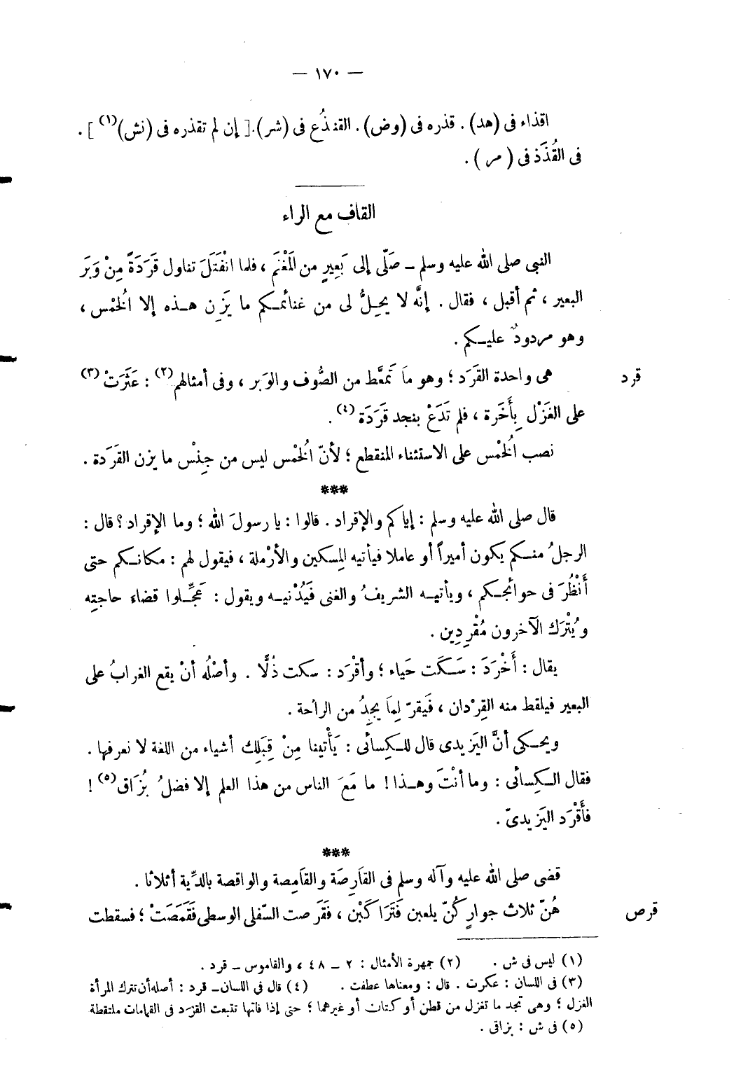 قرد النَّبِي صلى الله عَلَيْهِ وَسلم صلى إِلَى بعير من الْمغنم فَلَمَّا انْفَتَلَ تنَاول قردة من وبر الْبَعِير ثمَّ أقبل فَقَالَ. إِنَّه لَا يحل لي من غنائمكم مَا يزن هَذِه إِلَّا الخُمس وَهُوَ مَرْدُود عَلَيْكُم. هِيَ وَاحِدَة القرد وَهُوَ مَا تمعط من الصُّوف والوبر وَفِي أمثالهم: عثرت على الْغَزل بِأخرَة فَلم تدع بِنَجْد قردة. نصب الخُمس على الِاسْتِثْنَاء الْمُنْقَطع لِأَن الخُمس لَيْسَ من جنس مَا يزن القردة. قَالَ صلى الله عَلَيْهِ وَسلم: إيَّاكُمْ والإقراد. قَالُوا: يَا رَسُول الله وَمَا الإقراد قَالَ: الرجل مِنْكُم يكون أَمِيرا أَو عَاملا فيأتيه الْمِسْكِين والأرملة فَيَقُول لَهُم: مَكَانكُمْ حَتَّى أنظر فِي حَوَائِجكُمْ ويأتيه الشريف والغني فيدنيه وَيَقُول: عجلوا قَضَاء حَاجته وَيتْرك الْآخرُونَ مقردين. يُقَال: أخرد: سكت حَيَاء وأقرد: سكت ذلاًّ. وَأَصله أَن يَقع الْغُرَاب على الْبَعِير فيلقط مِنْهُ القردان فيقرّ لما يجد من الرَّاحَة. ويحكى أَن اليزيدي قَالَ للكسائي: يأتينا من قبلك أَشْيَاء من اللُّغَة لَا نعرفها فَقَالَ الْكسَائي: وَمَا أَنْت وَهَذَا مَا مَعَ النَّاس من هَذَا الْعلم إِلَّا فضل بزاق فأقرد اليزيدي.
