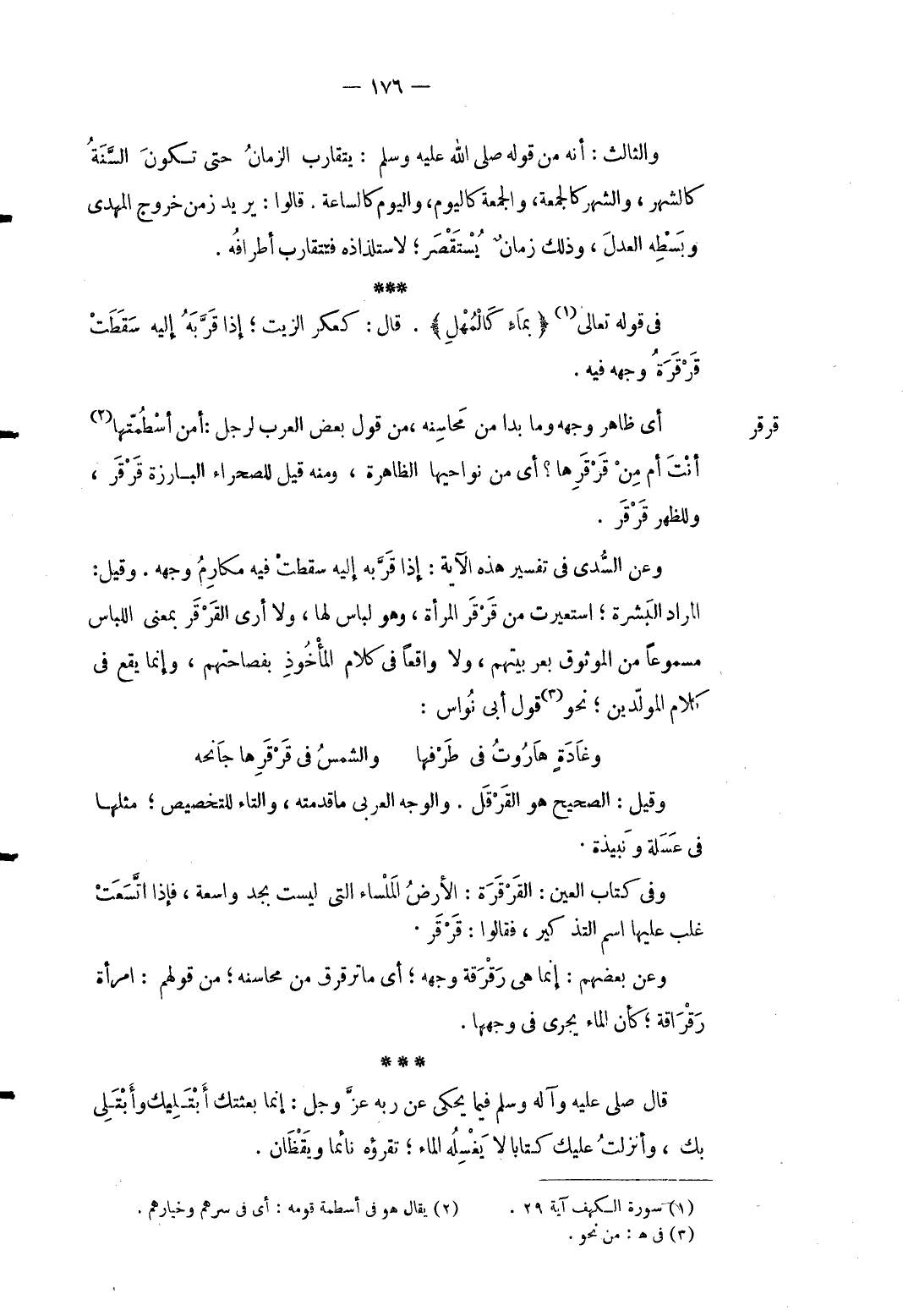 قرقر فِي قَوْله تَعَالَى {بمَاءٍ كَالْمُهْلِ} قَالَ: كَعَكرِ الزَّيْت إِذا قرَّبه إِلَيْهِ سَقَطت قرقرة وَجهه فِيهِ. أَي ظَاهر وَجهه وَمَا بدا من محاسنه من قَول بعض الْعَرَب لرجل: أَمن أسطمتها أَنْت أم من قرقرها أَي من نَوَاحِيهَا الظَّاهِرَة وَمِنْه قيل للصحراء البارزة قرقر وللظهر قرقر. وَعَن السّديّ فِي تَفْسِير هَذِه الْآيَة: إِذا قرَّبه إِلَيْهِ سَقَطت فِيهِ مَكَارِم وَجهه. وَقيل: المُرَاد الْبشرَة استعيرت من قرقر الْمَرْأَة وَهُوَ لِبَاس لَهَا وَلَا أرى القرقر بِمَعْنى اللبَاس مسموعاً من الموثوق بعربيتهم وَلَا وَاقعا فِي كَلَام الْمَأْخُوذ بفصاحتهم وَإِنَّمَا يَقع فِي كَلَام المولدين نَحْو قَول أبي نواس: ... وغَادَةٍ هَارُوتُ فِي طَرْفها ... والشمسُ فِي قَرْقَرِها جَانحة ... وَقيل: الصَّحِيح هُوَ القرقل. وَالْوَجْه الْعَرَبِيّ مَا قَدمته وَالتَّاء للتخصيص مثلهَا فِي عسلة ونبيذة. وَفِي كتاب الْعين: القرقرة: الأَرْض الملساء الَّتِي لَيست بجد وَاسِعَة فَإِذا اتَّسعت غلب عَلَيْهَا اسْم التَّذْكِير فَقَالُوا: قرقر. وَعَن بَعضهم: إِنَّمَا هِيَ رقرقة وَجهه أَي مَا ترقرق من محاسنه من قَوْلهم: امْرَأَة رقراقة كَأَن المَاء يجْرِي فِي وَجههَا.