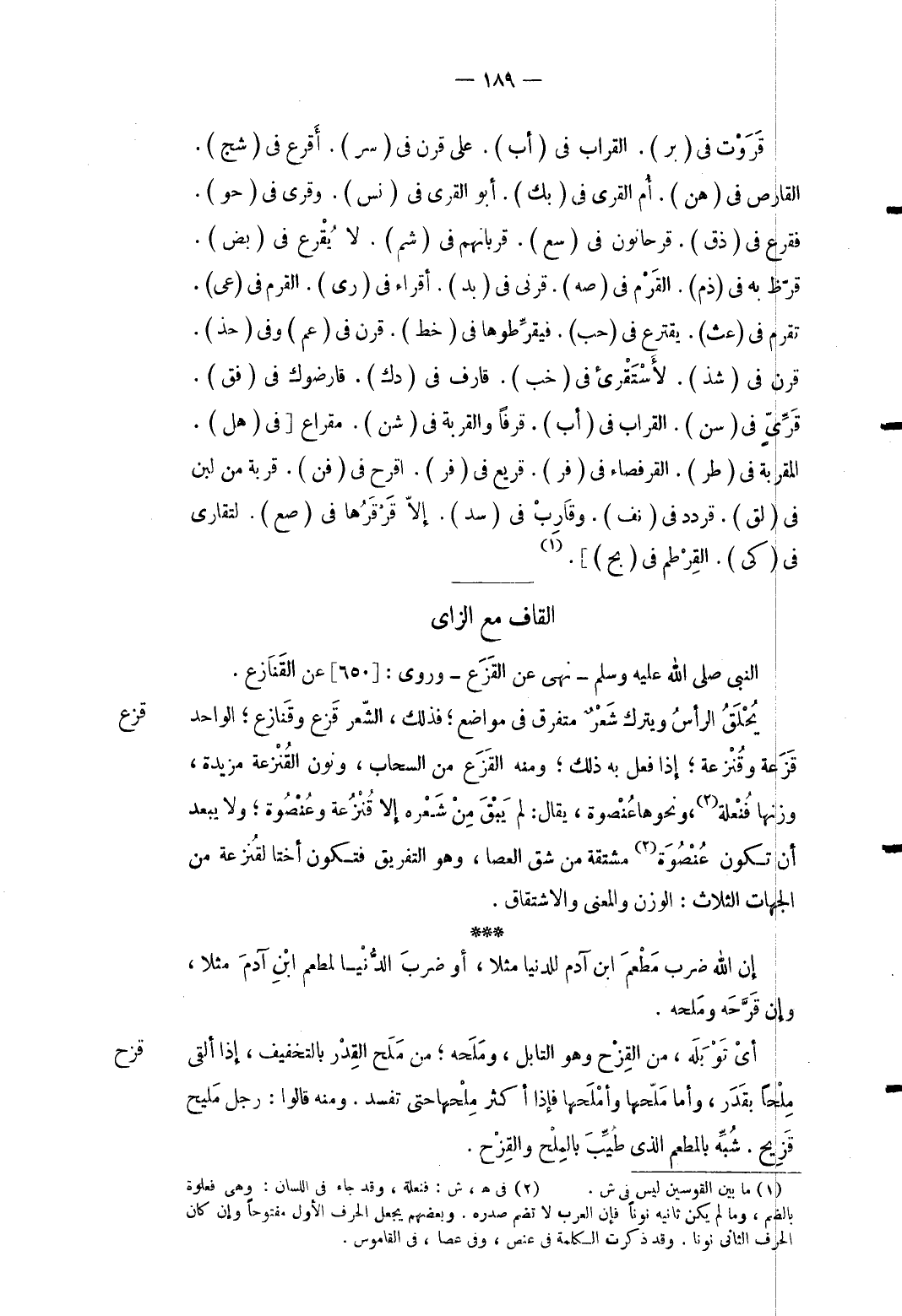 قزَح إِن الله ضرب مطعم ابْن آدم للدنيا مثلا أَو ضرب الدُّنْيَا لمطعم ابْن آدم مثلا وَإِن قرَّحة وملحه. أَي توبله من القزح وَهُوَ التابل وملحه من ملح الْقدر بِالتَّخْفِيفِ إِذا ألْقى ملحاً بِقدر وَأما ملحها وأملحها فَإِذا أَكثر ملحها حَتَّى تفْسد. وَمِنْه قَالُوا: رجل مليح قزيح. شُبه بالمطعم الَّذِي طيب بالملح والقزح.