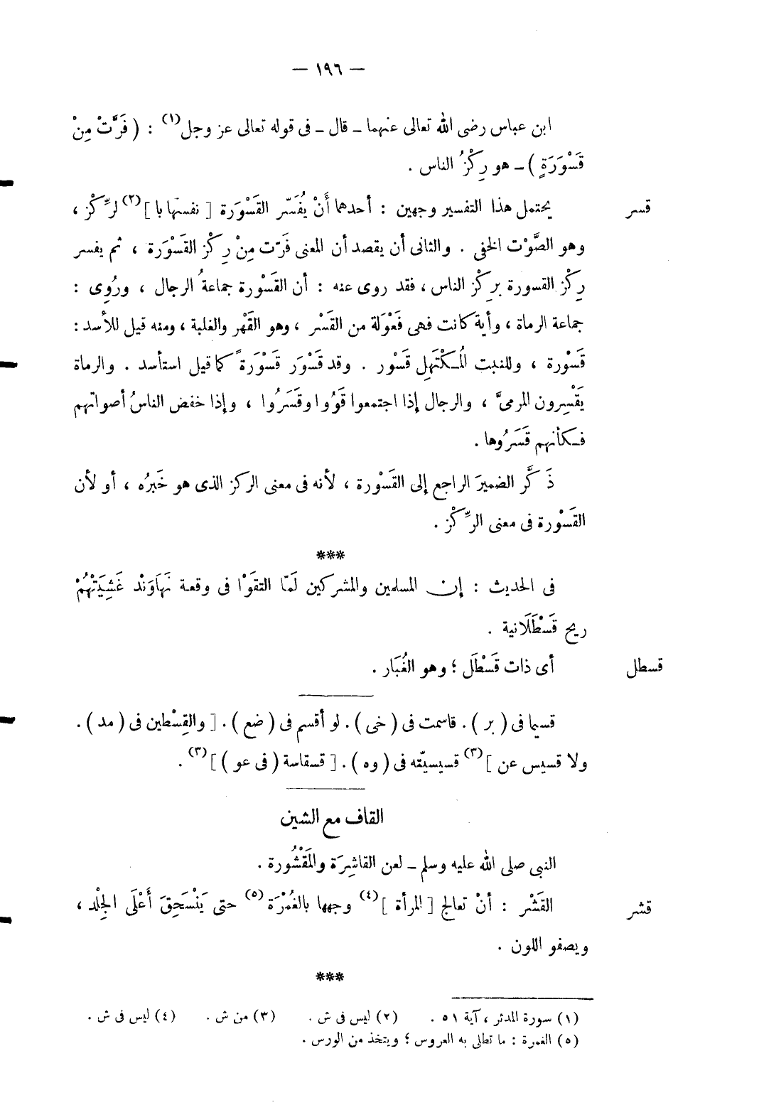 قسر ابْن عَبَّاس رَضِي الله تَعَالَى عَنْهُمَا قَالَ فِي قَوْله تَعَالَى عزوجل: {فَرَّتْ مِنْ قَسْوَرَةٍ} هُوَ ركز النَّاس. يحْتَمل هَذَا التَّفْسِير وَجْهَيْن: أَحدهمَا أَن يُفَسر القسورة نَفسهَا بالركز وَهُوَ الصَّوْت الْخَفي. وَالثَّانِي أَن يقْصد أَن الْمَعْنى فرت من ركز القسورة ثمَّ يُفَسر ركز القسورة بركز النَّاس فقد روى عَنهُ: أَن القسورة جمَاعَة الرِّجَال وروى: جمَاعَة الرُّمَاة وأية كَانَت فَهِيَ فعولة من القسر وَهُوَ الْقَهْر وَمِنْه قيل للأسد: قسورة وللنبت المكتهل قسور. وَقد قسور قسورة كَمَا قيل استأسد. وَالرُّمَاة يقسرون المرمى وَالرِّجَال إِذا اجْتَمعُوا قووا وقسروا وَإِذا خفض النَّاس أَصْوَاتهم فكأنهم قسروها. ذكر الضَّمِير الرَّاجِع إِلَى القسورة لِأَنَّهُ فِي معنى الركز الَّذِي هُوَ خَبره أَو لِأَن القسورة فِي معنى الركز.