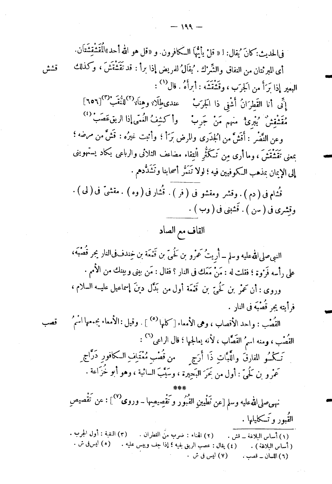 قشش فِي الحَدِيث: كَانَ يُقَال: {قل يَا أَيهَا الْكَافِرُونَ} و {قل هُوَ الله أحد} المقشقشتان. أَي المبرئتان من النِّفَاق والشرك. يُقَال للْمَرِيض إِذا برأَ: قد تقشقش وَكَذَلِكَ الْبَعِير إِذا برأَ من الجرب وقشقشه: أَبرَأَهُ قَالَ: ... إنِّي أَنا القَطِرَانُ أَشْفِى ذَا الجَرَبْ ... عِنْدِي طِلاَءٌ وهِنَاءٌ للنُّقَبْ