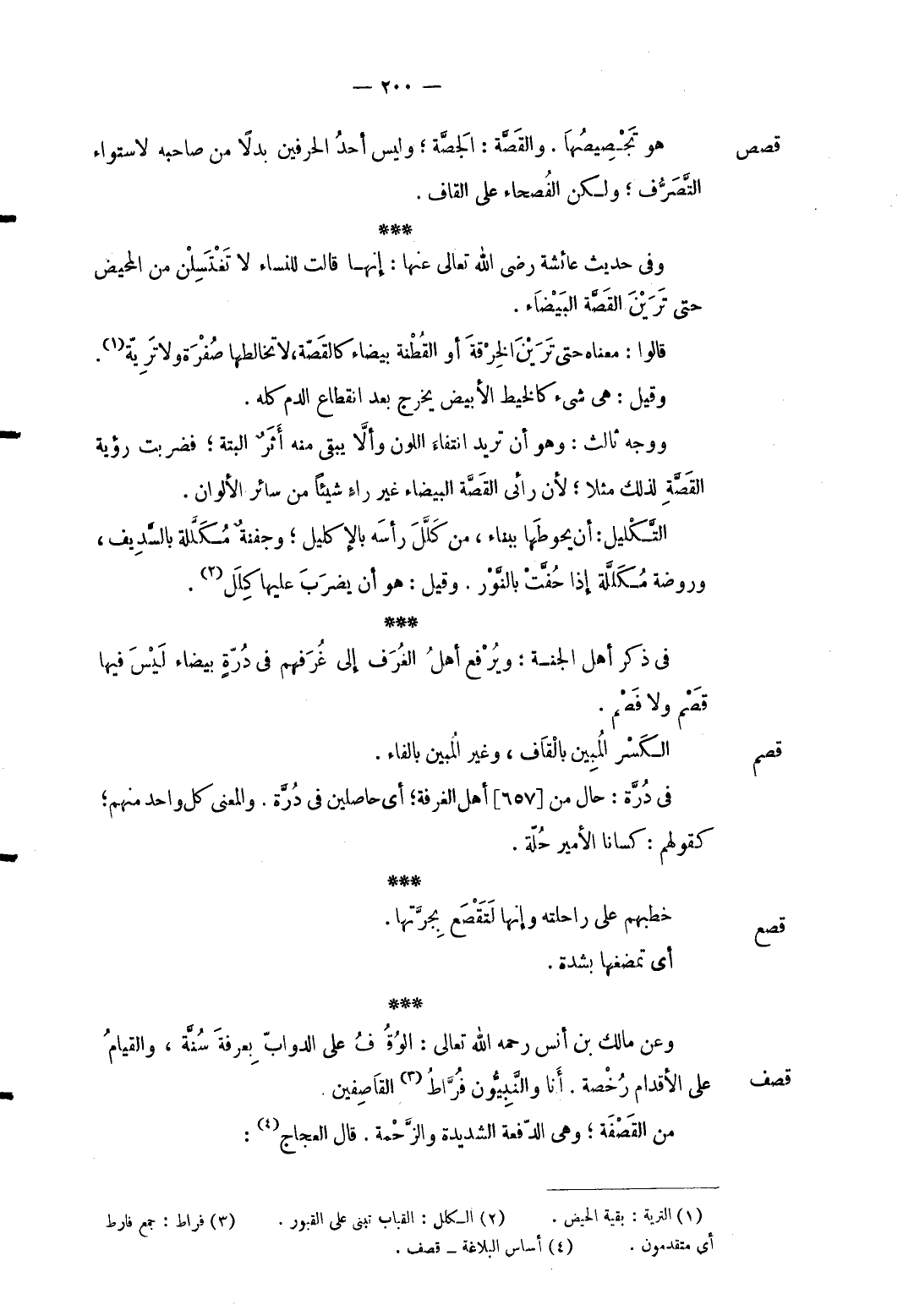 قصَص هُوَ تجصيصها. والقصة: الجصة وَلَيْسَ أحد الحرفين بَدَلا من صَاحبه لِاسْتِوَاء التَّصَرُّف وَلَكِن الفصحاء على الْقَاف. وَفِي حَدِيث عَائِشَة رَضِي الله تَعَالَى عَنْهَا: إِنَّهَا قَالَت للنِّسَاء لَا تغتسلن من الْمَحِيض حَتَّى تَرين القصَّة الْبَيْضَاء. قَالُوا: مَعْنَاهُ حَتَّى تَرين الْخِرْقَة أَو القطنة بَيْضَاء كالقصة لَا تخالطها صفرَة وَلَا ترية. وَقيل: هِيَ شَيْء كالخيط الْأَبْيَض يخرج بعد انْقِطَاع الدَّم كُله. وَوجه ثَالِث: وَهُوَ أَن تُرِيدُ انْتِفَاء اللَّوْن وألاَّ يبْقى مِنْهُ أثرٌ الْبَتَّةَ فَضربت رُؤْيَة القصَّة لذَلِك مثلا لِأَن رائي القصَّة الْبَيْضَاء غير راءٍ شَيْئا من سَائِر الألوان. التَّكليل: أَن يحوطها بِبِنَاء من كلل رَأسه بالإكليل وجفنة مكللة بالسديف وروضة مكللة إِذا حفت بِالنورِ. وَقيل: هُوَ أَن يضْرب عَلَيْهَا كلل.