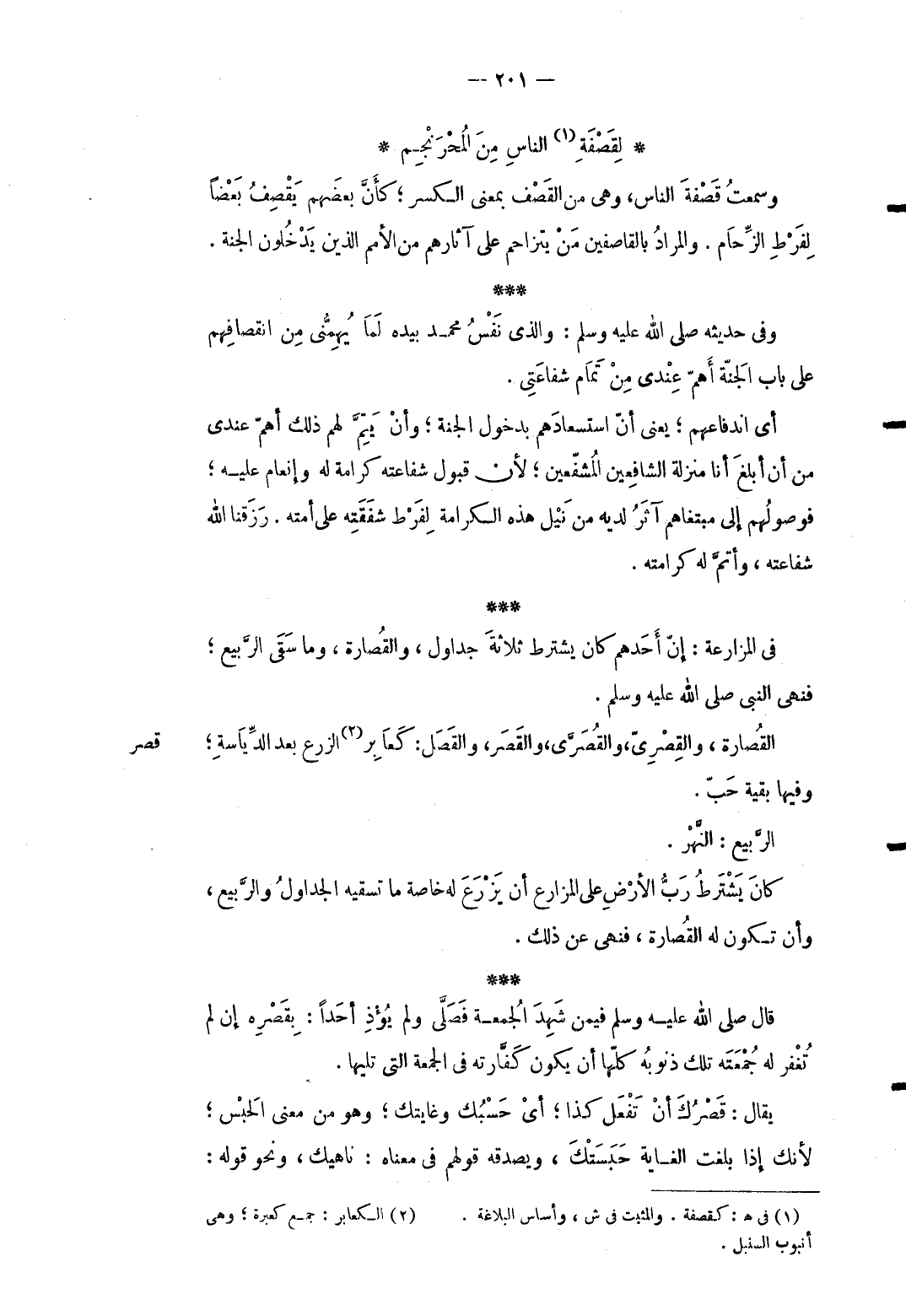 قصر فِي الْمُزَارعَة: إِن أحدهم كَانَ يشْتَرط ثَلَاثَة جداول والقصارة وَمَا سقى الرّبيع فَنهى النَّبِي صلى الله عَلَيْهِ وَسلم. القُصارة والقصرى والقصرَّى وَالْقصر والقصل: كعابر الزَّرْع بعد الدياسة وفيهَا بَقِيَّة حبّ. الرّبيع: النَّهر. كَانَ يشْتَرط ربُّ الأَرْض على الْمزَارِع أَن يزرع لَهُ خَاصَّة مَا تسقيه الجداول وَالربيع وَأَن تكون لَهُ القصارة فَنهى عَن ذَلِك.