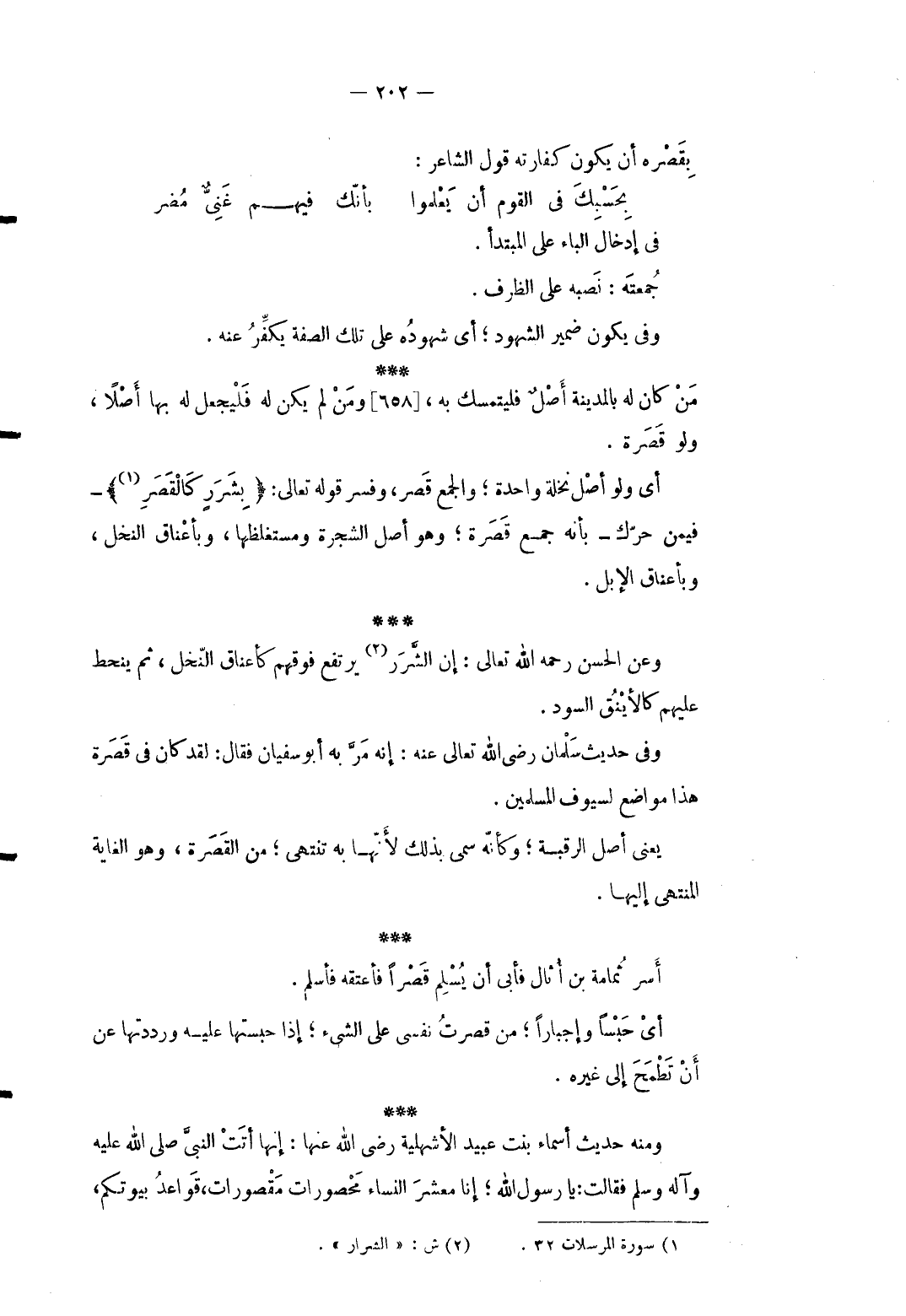 بقصره أَن يكون كَفَّارَته قَول الشَّاعِر: ... بِحَسْبِكَ فِي الْقَوْم أَن يَعْلموا ... بأنّك فيهم غَنِيٌّ مُضر ... فِي إِدْخَال الْبَاء على الْمُبْتَدَأ. جمعته: نَصبه على الظّرْف. وَفِي يكون ضمير الشُّهُود أَي شُهُوده على تِلْكَ الصّفة يكفِّر عَنهُ. من كَانَ لَهُ بِالْمَدِينَةِ أصل فليتمسك بِهِ وَمن لم يكن لَهُ فليجعل لَهُ بهَا أصلا وَلَو قصرة. أَي وَلَو أصل نَخْلَة وَاحِدَة وَالْجمع قصر وَفسّر قَوْله تَعَالَى {بِشَرَرٍ كَالْقَصَرِ} فِيمَن حرّك بِأَنَّهُ جمع قصرة وَهُوَ أصل الشَّجَرَة ومستغلظها وبأعناق النّخل وبأعناق الْإِبِل. وَعَن الْحسن رَحمَه الله تَعَالَى: إِن الشرر يرْتَفع فَوْقهم كأعناق النّخل ثمَّ ينحط عَلَيْهِم كالأينق السود. وَفِي حَدِيث سلمَان رَضِي الله تَعَالَى عَنهُ: إِنَّه مرَّ بِهِ أَبُو سُفْيَان فَقَالَ: لقد كَانَ فِي قصرة هَذَا مَوَاضِع لسيوف الْمُسلمين. يَعْنِي أصل الرَّقَبَة وَكَأَنَّهُ سمى بذلك لِأَنَّهَا بِهِ تَنْتَهِي من القصرة وَهُوَ الْغَايَة الْمُنْتَهى إِلَيْهَا. أسر ثُمَامَة بن أُثال فَأبى أَن يُسلم قصراً فَأعْتقهُ فَأسلم. أَي حبسا وإجباراً من قصرت نَفسِي على الشَّيْء إِذا جبستها عَلَيْهِ ورددتها عَن أَن تطمح إِلَى غَيره. وَمِنْه حَدِيث أَسمَاء بنت عبيد الأشهلية رَضِي الله عَنْهَا: إِنَّهَا أَتَت النَّبِي صلى الله عَلَيْهِ وَسلم فَقَالَت: يَا رَسُول الله إِنَّا معشر النِّسَاء محصورات مقصورات قَوَاعِد بُيُوتكُمْ
