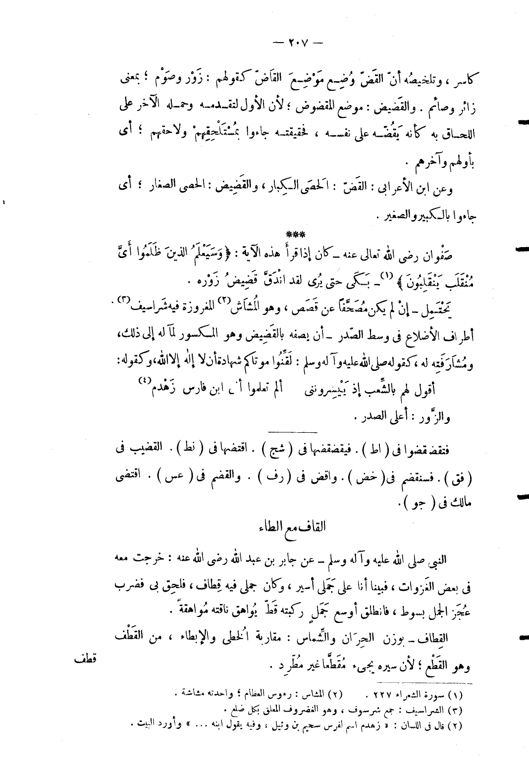 كاسر وتلخيصه أَن القضّ وُضع مَوضِع القاضّ كَقَوْلِهِم: زور وَصَوْم بِمَعْنى زائر وصائم. والقضيض: مَوضِع المقضوض لِأَن الأول لتقدمه وَحمله الآخر على اللحاق بِهِ كَأَنَّهُ يقضّه على نَفسه فحقيقته جَاءُوا بمستلحقهم وَلَا حَقهم أَي بأولهم وَآخرهمْ. وَعَن ابْن الْأَعرَابِي: القضّ: الْحَصَى الْكِبَار والقضيض: الْحَصَى الصغار أَي جَاءُوا بالكبير وَالصَّغِير. صَفْوَان رَضِي الله تَعَالَى عَنهُ كَانَ إِذا قَرَأَ هَذِه الْآيَة: {وَسَيَعْلَمُ الذينَ ظَلَمُوا أَيَّ مُنْقَلَب يَنْقَلِبُونَ} بَكَى حَتَّى يُرى لقد اندقَّ قضيض زوره. يحْتَمل إِن لم يكن مُصحَّفاً عَن قصَص وَهُوَ المشاش المغروزة فِيهِ شراسيف أَطْرَاف الأضلاع فِي وسط الصَّدْر أَن يصفه بالقضيض وَهُوَ الكسور لمآ لَهُ إِلَى ذَلِك ومشارفته لَهُ كَقَوْلِه صلى الله عَلَيْهِ وَسلم: لقنوا مَوْتَاكُم شَهَادَة أَن لَا إِلَه إِلَّا الله وَكَقَوْلِه: ... أَقُول لَهُم بالشِّعب إِذْ يَيْسِرونني ... ألم تعلمُوا أَن ابْن فَارس زَهْدم ... والزور: أَعلَى الصَّدْر.