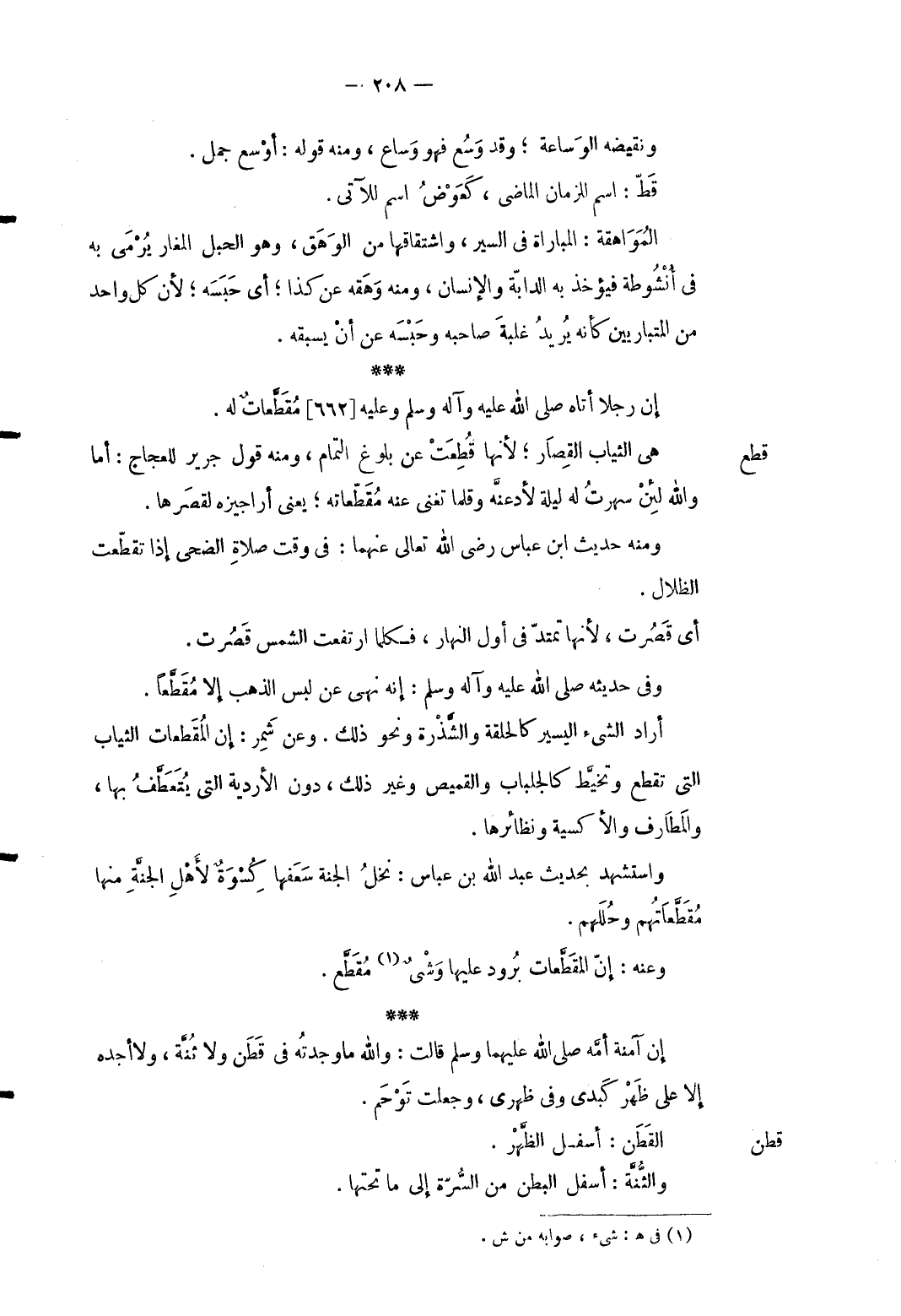 قطع إِن رجلا أَتَاهُ صلى الله عَلَيْهِ وَسلم وَعَلِيهِ مقطعات لَهُ. هِيَ الثِّيَاب الْقصار لِأَنَّهَا قطعت عَن بُلُوغ التَّمام وَمِنْه قَول جرير للعجاج: أما وَالله لَئِن سهرت لَهُ لَيْلَة لأدعنه وقلما تغنى عَنهُ مقطعاته يَعْنِي أراجيزه لقصرها. وَمِنْه حَدِيث ابْن عَبَّاس رَضِي الله تَعَالَى عَنهُ تَعَالَى عَنْهُمَا: فِي وَقت صَلَاة الضُّحَى إِذا تقطعت الظلال. أَي قصرت لِأَنَّهَا تمتد فِي أول النَّهَار فَكلما ارْتَفَعت الشَّمْس قصرت. وَفِي حَدِيثه صلى الله عَلَيْهِ وَسلم: أَنه نهى عَن لبس الذَّهَب إِلَّا مقطَّعاً. أَرَادَ الشَّيْء الْيَسِير كالحلقة والشذرة وَنَحْو ذَلِك. وَعَن شمر: إِن المقطعات الثِّيَاب الَّتِي تقطع وتخيَّط كالجلباب والقميص وَغير ذَلِك دون الأردية الَّتِي يتعطف بهَا والمطارف والأكسية ونظائرها. وَاسْتشْهدَ بِحَدِيث عبد الله بن عَبَّاس: نخل الْجنَّة سعفها كسْوَة لأهل الْجنَّة مِنْهَا مقطَّعاتهم وحللهم. وَعنهُ: إِن المقطعات برود عَلَيْهَا وشى مقطع.