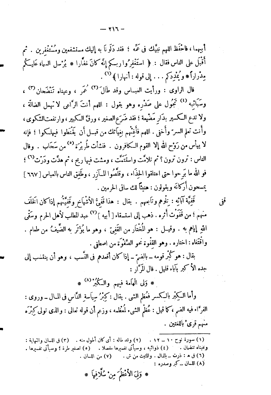 أَبِيهِمَا فاحفظ اللَّهُمَّ نبيك فِي عمَّه فقد دلونا بِهِ إِلَيْك مستشفعين ومستغفرين. ثمَّ أقبل على النَّاس فَقَالَ: {استَغْفِرُوا ربكُم إِنَّه كانَ غفَّارا يُرْسل السماءَ عَليكُم مِدْراراً ويُمْدِدكم} ... إِلَى قَوْله: {أَنهَارًا} قَالَ الرَّاوِي: وَرَأَيْت الْعَبَّاس وَقد طَال عمر وَعَيناهُ تَنْضَحَانِ وسبائبه تجول على صَدره وَهُوَ يَقُول: اللَّهُمَّ أَنْت الرَّاعِي لَا تهمل الضَّالة وَلَا تدع الكسير بدار مضيعة فقد ضرع الصَّغِير ورقَّ الْكَبِير وَارْتَفَعت الشكوى وَأَنت تعلم السرّ وأخفى. اللَّهُمَّ فأغثهم بغياثك من قبل أَن يقنطوا فيهلكوا فَإِنَّهُ لَا ييأس من روح الله إِلَّا الْقَوْم الْكَافِرُونَ. فَنَشَأَتْ طريرة من سَحَاب. وَقَالَ: النَّاس: ترَوْنَ ترَوْنَ ثمَّ تلامَّت واستتمَّت ومشت فِيهَا ريح ثمَّ هدت وَدرت فوَاللَّه مَا برحوا حَتَّى اعتلقوا الْحذاء وقلَّصوا المآزر وطفق النَّاس بِالْعَبَّاسِ يمسحون أَرْكَانه وَيَقُولُونَ: هَنِيئًا لَك ساقي الْحَرَمَيْنِ. قفيَّة آبَائِهِ: تلوهم وتابعهم. يُقَال: هَذَا قفي الْأَشْيَاخ وقفيتهم إِذا كَانَ الْخلف مِنْهُم من قَفَوْت أَثَره. ذهب إِلَى استسقاء [أَبِيه] عبد الْمطلب لأهل الْحرم وَسَقَى الله إيَّاهُم بِهِ. وَقيل: هُوَ الْمُخْتَار من القفي وَهُوَ مَا يُؤثر بِهِ الضَّيْف من طَعَام. واقتفاه: اخْتَارَهُ. وَهُوَ القفوة نَحْو الصفوة من اصْطفى. يُقَال: هُوَ كبر قومه بِالضَّمِّ إِذا كَانَ أقعدهم فِي النّسَب وَهُوَ أَن ينتسب إِلَى جده الْأَكْبَر بآباء قَلِيل. قَالَ المرَّار: ... وَلى الْهَامة فيهم والكُبُرْ