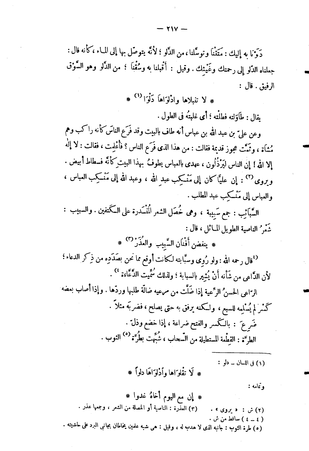 يُقَال: طاولته فطلته: أَي غلبته فِي الطول. وَعَن عَليّ بن عبد الله بن عَبَّاس أَنه طَاف بِالْبَيْتِ وَقد فرع النَّاس كَأَنَّهُ رَاكب وهم مشَاة وتمت عَجُوز قديمَة فَقَالَت: من هَذَا الَّذِي فرغ النَّاس فأُعلمت فَقَالَت: لَا إِلَه إِلَّا الله إِن النَّاس ليرذلون عهدي بِالْعَبَّاسِ يطوف بِهَذَا الْبَيْت كَأَنَّهُ فسطاط أَبيض. ويروي: إِن عليا كَانَ إِلَى منْكب عبد الله وَعبد الله إِلَى منْكب الْعَبَّاس وَالْعَبَّاس إِلَى منْكب عبد الْمطلب. السبائب: سبيبة وَهِي خصل الشّعْر المنسدرة على الْكَتِفَيْنِ. والسبيب: شعر الناصية الطَّوِيل المائل قَالَ: ... ينفضن أَفْنَان السَّبِيب والعُذَرْ