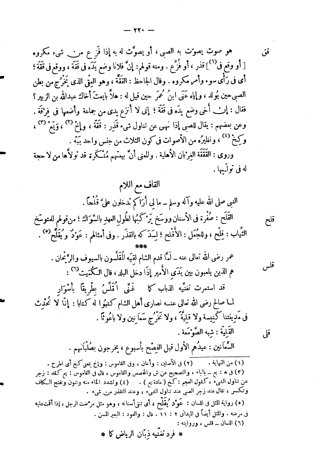 قق هُوَ صَوت يصوت بِهِ الصَّبِي أَو يصوت لَهُ بِهِ إِذا فزع من شَيْء مَكْرُوه أَو وَقع فِي قذر أَو فزع. وَمِنْه قَوْلهم: إِن فلَانا وضع يَده فِي ققة وَوَقع فِي ققة أَي فِي رَأْي سوء وَأمر مَكْرُوه وَقَالَ الجاحظ: الققة وَهُوَ العقى الَّذِي يخرج من بطن الصَّبِي حِين يُولد وإياه عَنى ابْن عمر حِين قيل لَهُ: هلاَّ بَايَعت أَخَاك عبد الله بن الزبير فَقَالَ: إِن أخي وضع يَده فِي ققة إِنِّي لَا أنزع يَدي من جمَاعَة وأضعها فِي فرقة وَعَن بَعضهم: يُقَال للصَّبِيّ إِذا نهى عَن تنَاول شَيْء قذر: ققة وإخ ويع وكخ وَنَظِيره من الْأَصْوَات فِي كَون الثَّلَاث من جنس وَاحِد ببه. وروى: القققة الْغرْبَان الْأَهْلِيَّة. وَالْمعْنَى أَن بيعتهم مُنكرَة قد تولاها من لاحجة لَهُ فِي توليها.