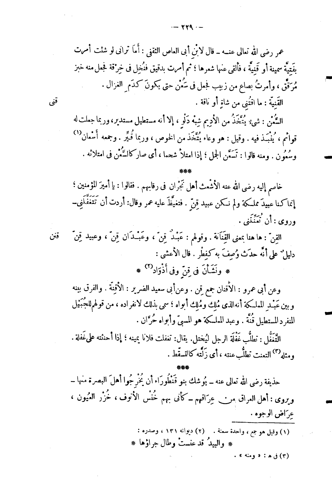 قنى عمر رَضِي الله تَعَالَى عَنهُ قَالَ لِابْنِ أبي الْعَاصِ الثَّقَفِيّ: أما تراني لَو شِئْت أمرت بفتية سَمِينَة أَو قنية فألقي عَنْهَا شعرهَا ثمَّ أمرت بدقيق فنُخل فِي خرقَة فَجعل مِنْهُ خبز مرقق وَأمرت بِصَاع من زبيب فَجعل فِي سعن حَتَّى يكون كَدم الغزال. الْقنية: مَا اقتنى من شَاة أَو نَاقَة. السَّعن: شَيْء يتَّخذ من الْأَدِيم شبه دلوٍ إِلَّا أَنه مستطيل مستدير وَرُبمَا جعلت لَهُ قَوَائِم ينْبذ فِيهِ. وَقيل: هُوَ وعَاء يُتَّخذ من الخوص وَرُبمَا قُيَّر. وَجمعه أسعان وسعون. وَمِنْه قَالُوا: تسعَّن الْجمل إِذا امْتَلَأَ شحما أَي صَار كالسعن فِي امتلائه.